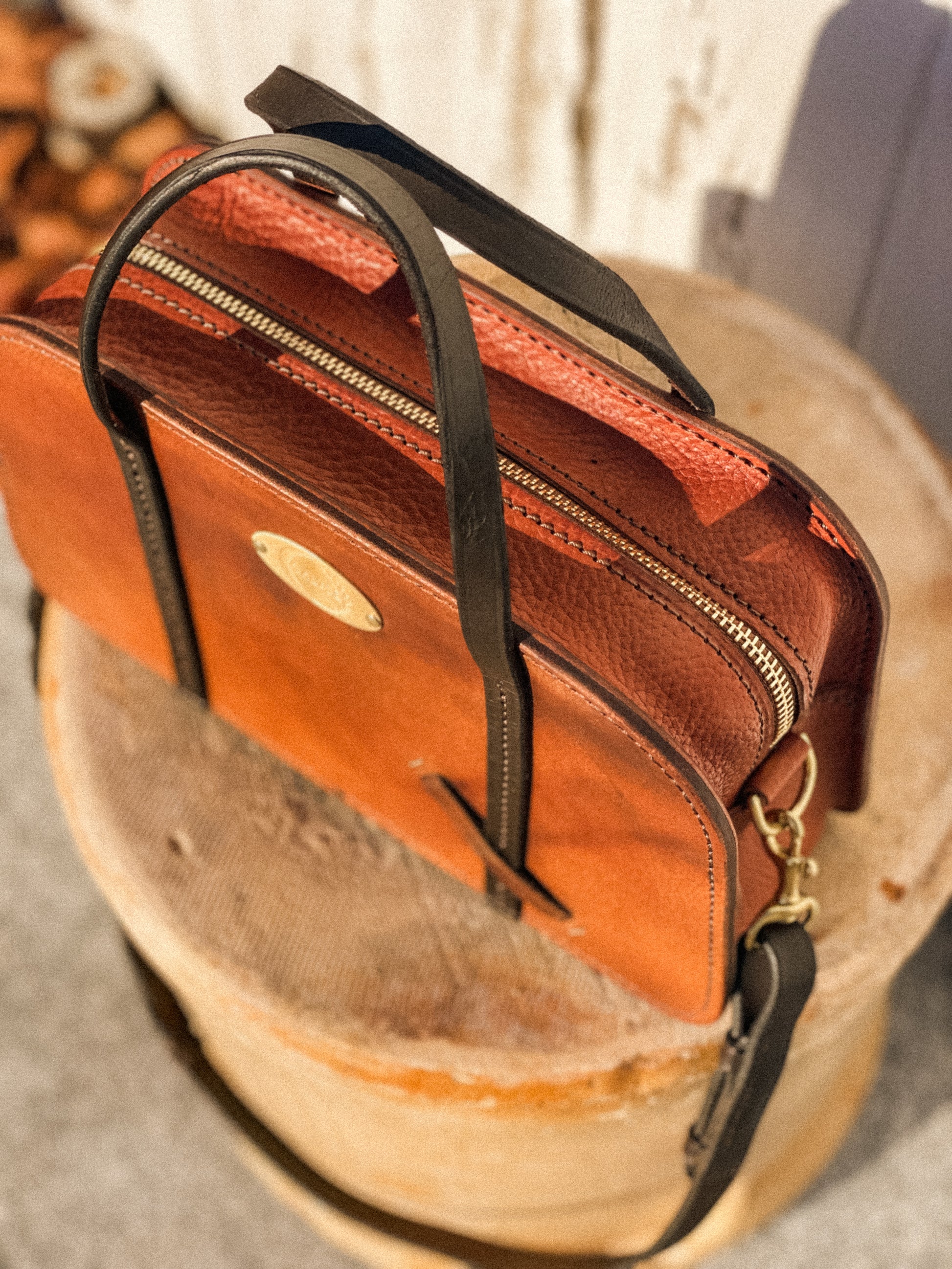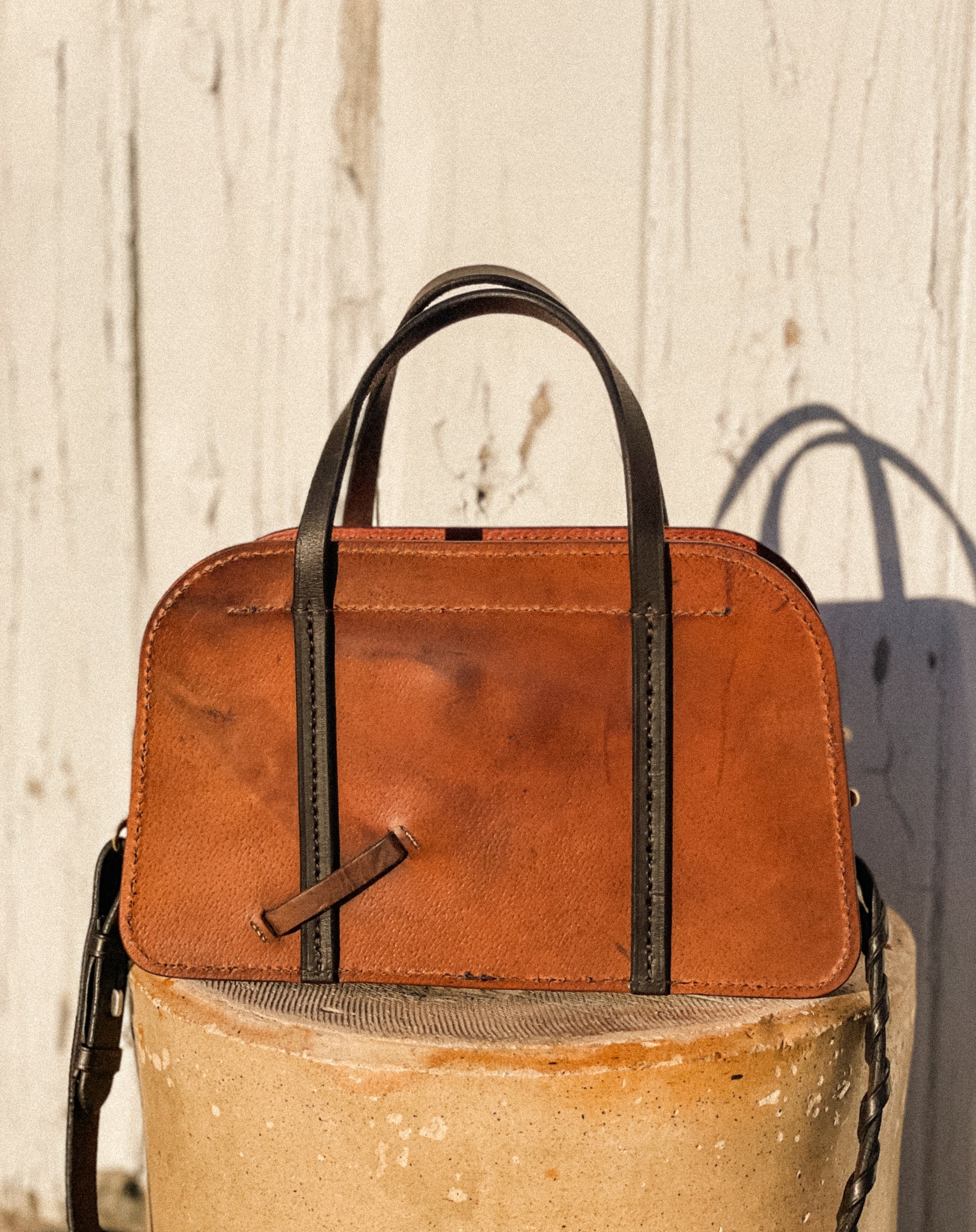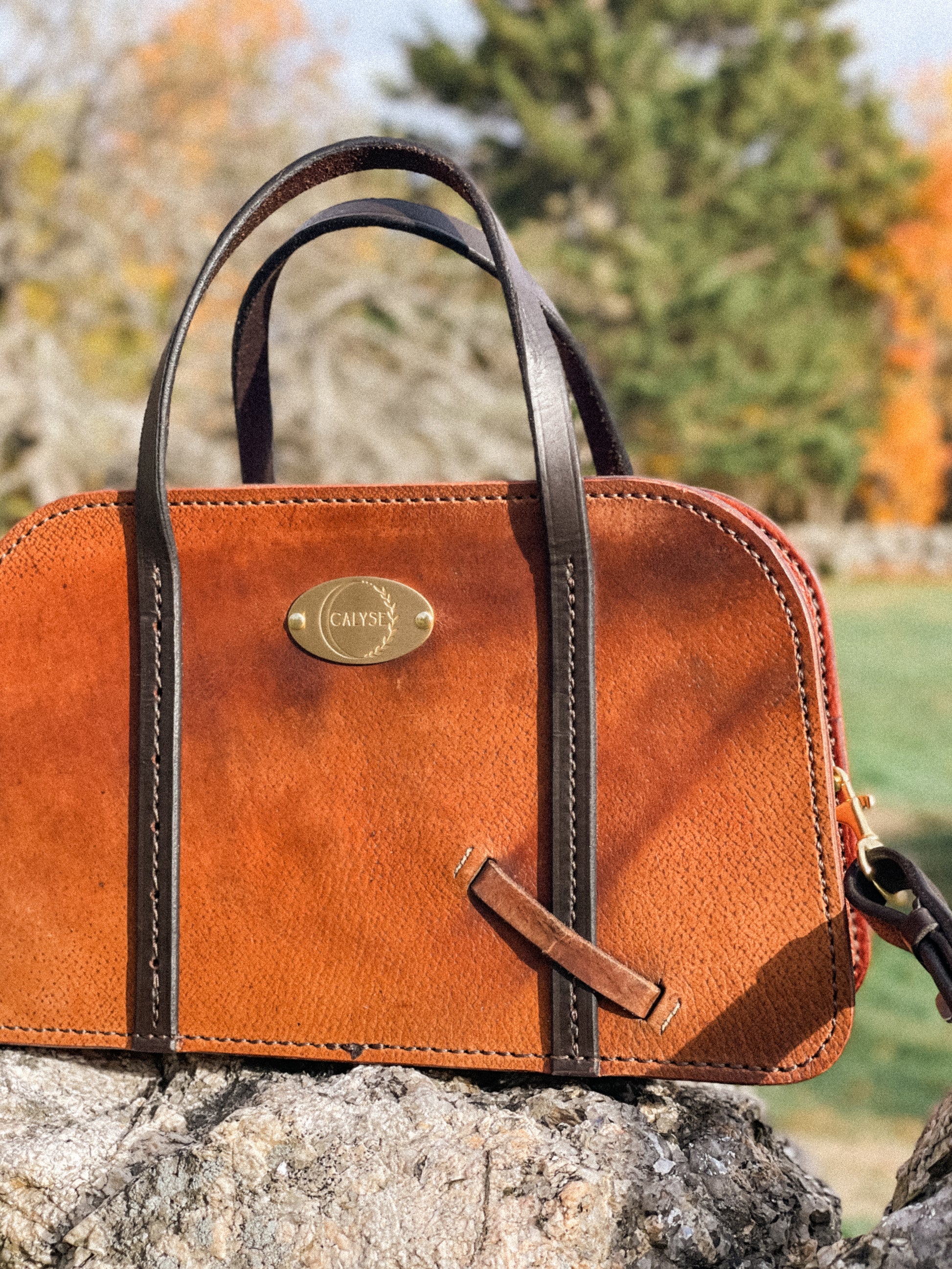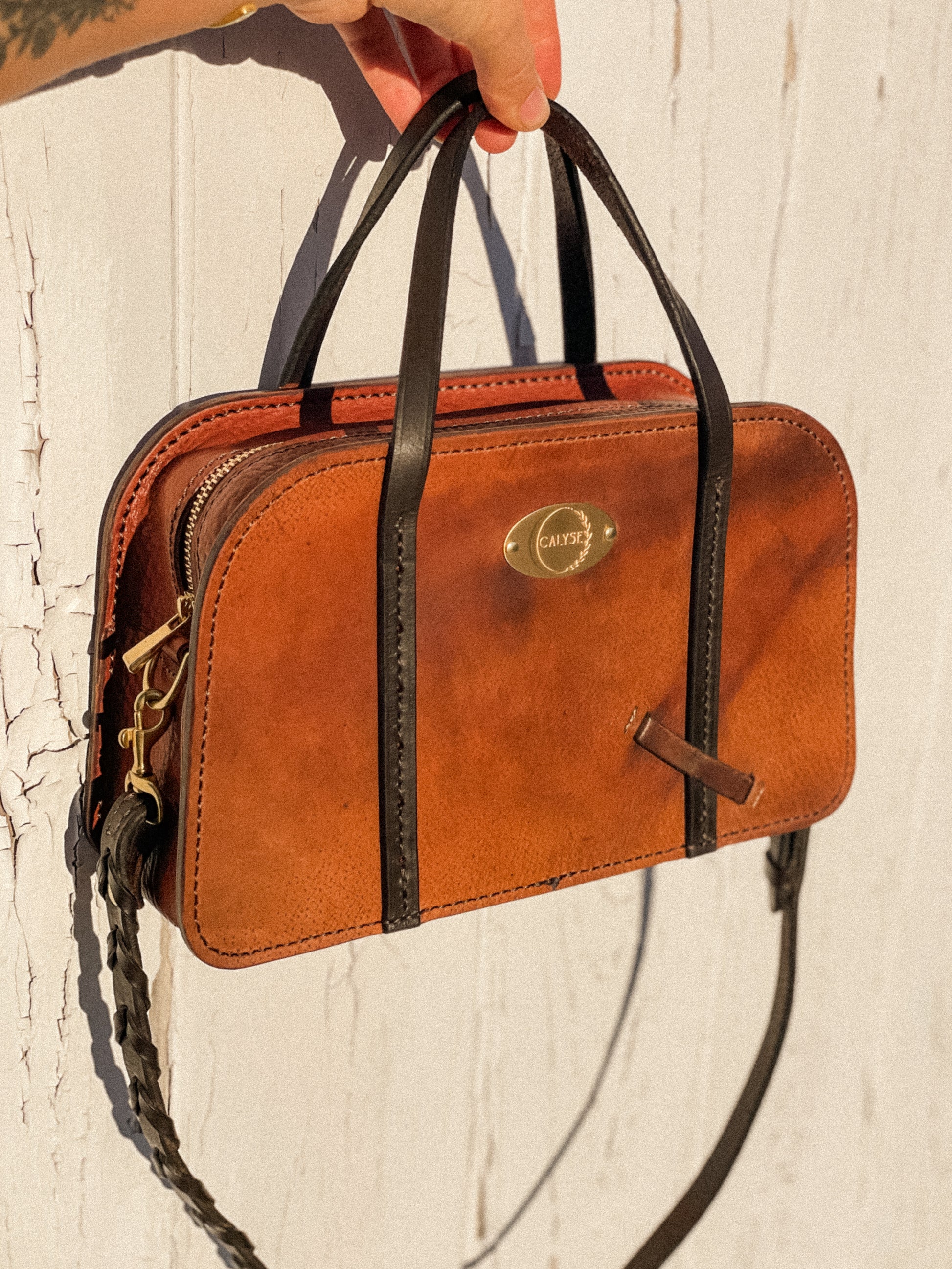 Inspiration was derived from an antique doctors case and the desire to press forward on the possibilities of what can be crafted from a vintage saddle. An asset to your classic style that will flow timelessly through the years. Althea’s structured body frames the zippered top opening. Handles are stitched to the front and back for easy grab and go. Complete with an interior pocket for small items and detachable shoulder strap. Adorned in solid brass hardware.