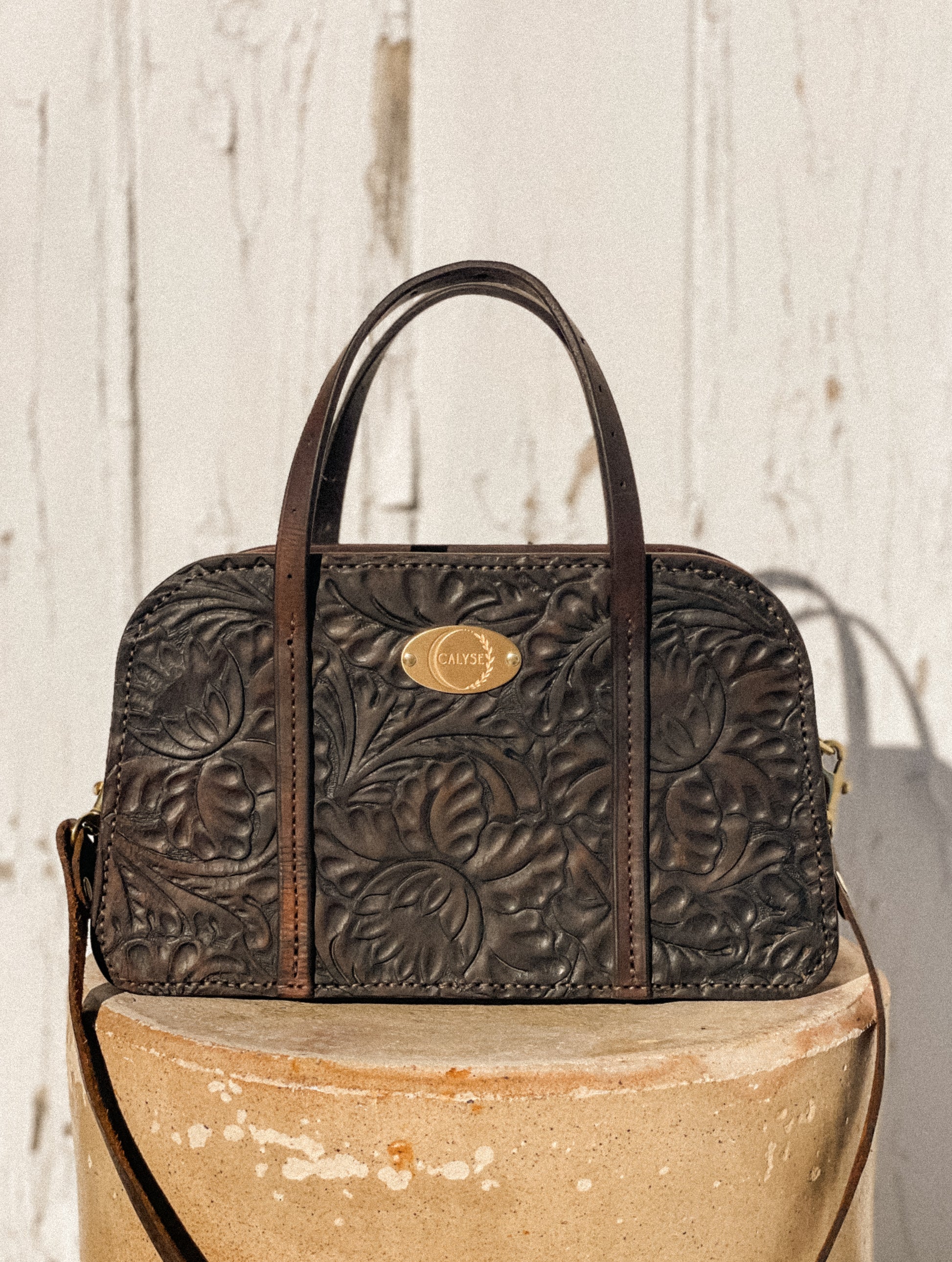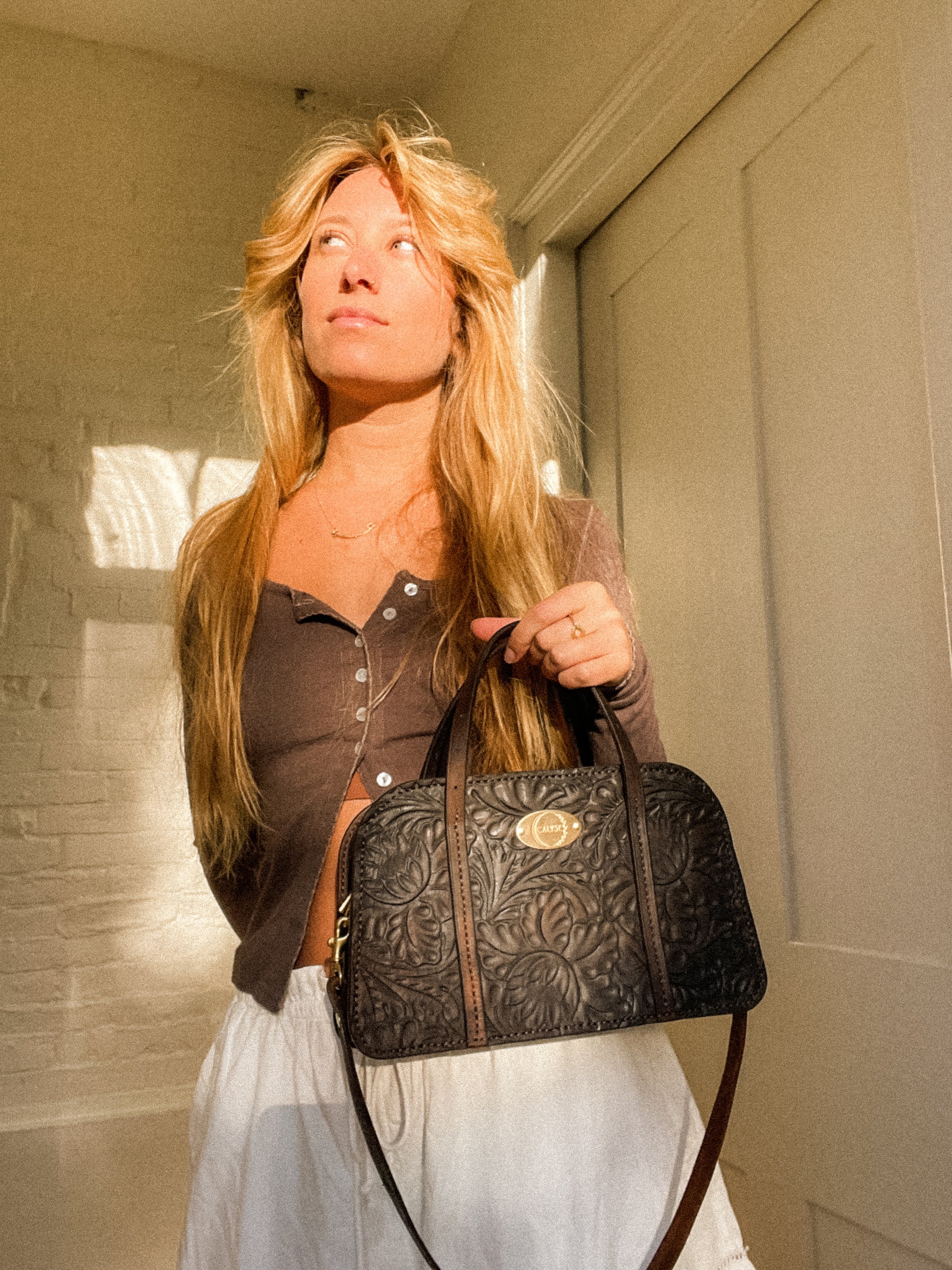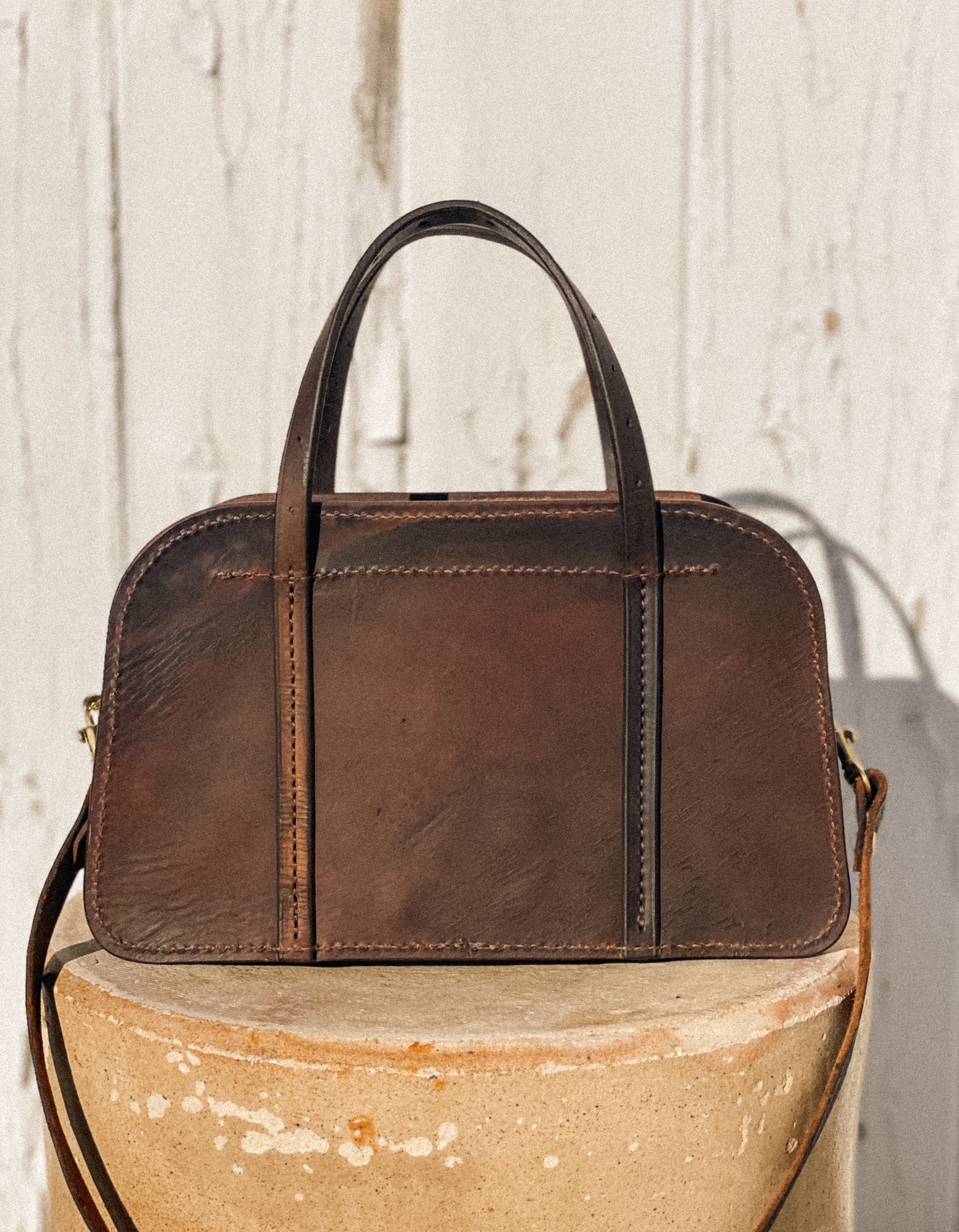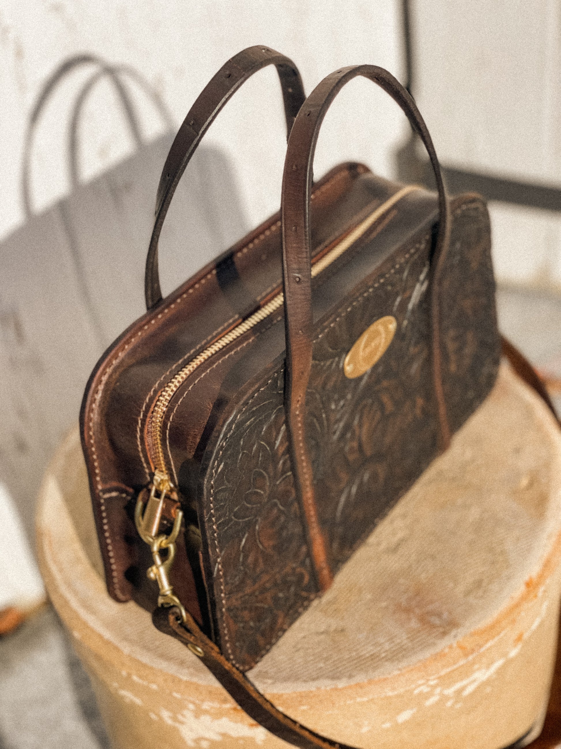Inspiration was derived from an antique doctor's case and the desire to press forward on the possibilities of what can be crafted from a vintage western saddle. An asset to your classic style that will flow timelessly through the years. Althea’s structured body frames the zippered top opening. Handles are stitched to the front and back for easy grab and go. Complete with an interior snapped pocket for small items and detachable shoulder strap. Adorned in solid brass hardware.