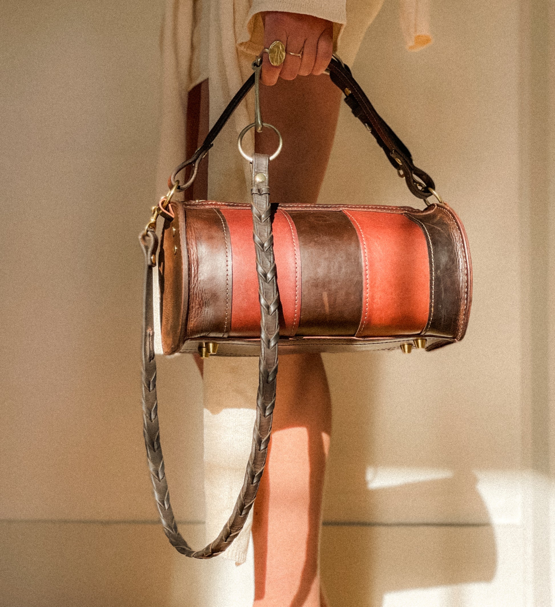 Anima e Corpo — soul and body — is a singular atelier-exclusive piece, reflecting a culmination of my experience in the craft. Carefully selected panels of patinated saddle leather are assembled to form a sculptural cylindrical silhouette, revealing nuanced variations in tone and texture.