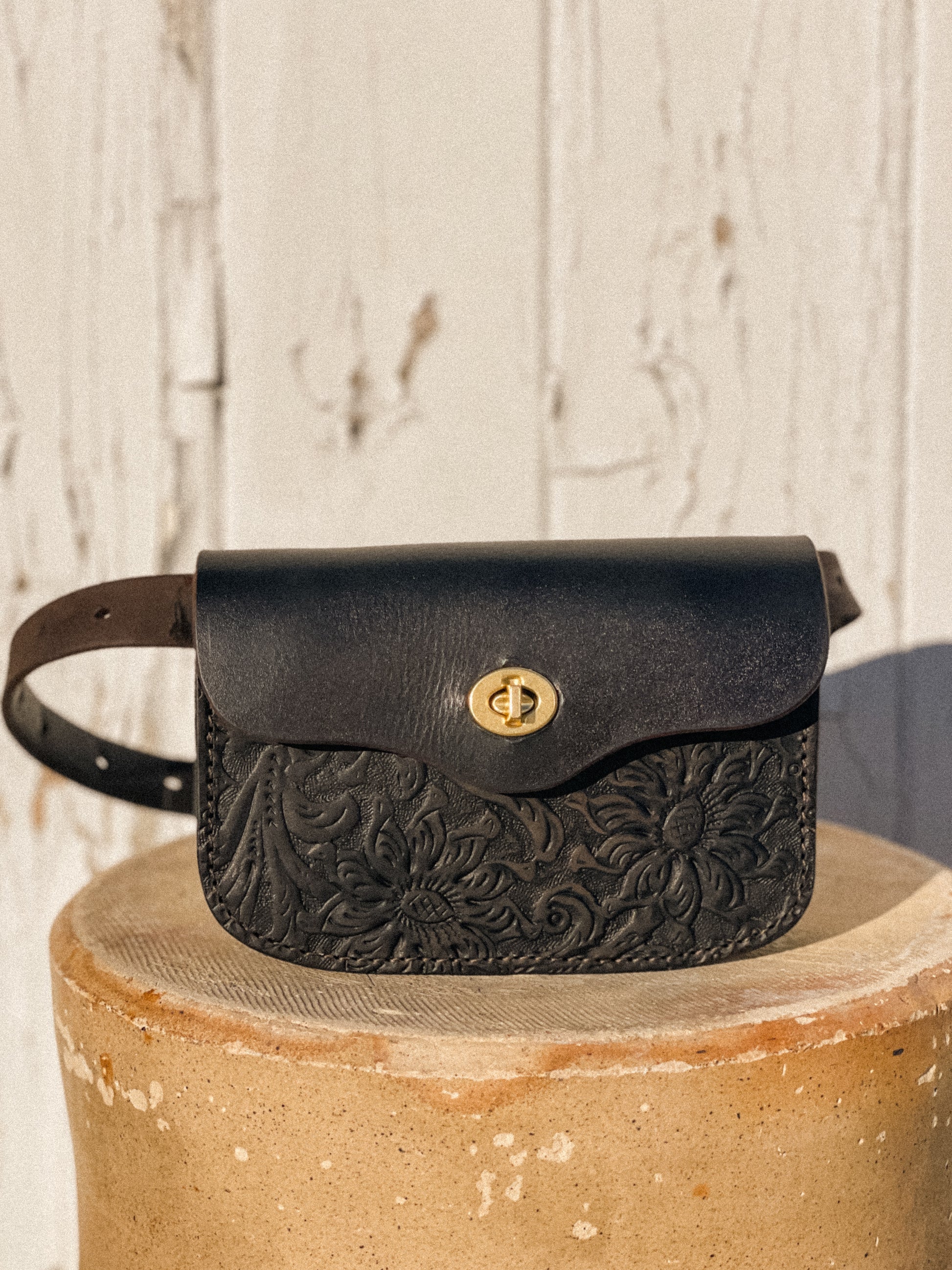 The Billie is an adorable belt bag that will store your phone, small wallet, keys, shades, and other small items on the go, hands free! The leather pouch made from recycled saddle leather comes with a belt attached with multiple adjustments. The belt can be slid out and use on its own too! All secured with a no-fuss turn lock and solid brass hardware. Edges are burnished and waxed for longevity.