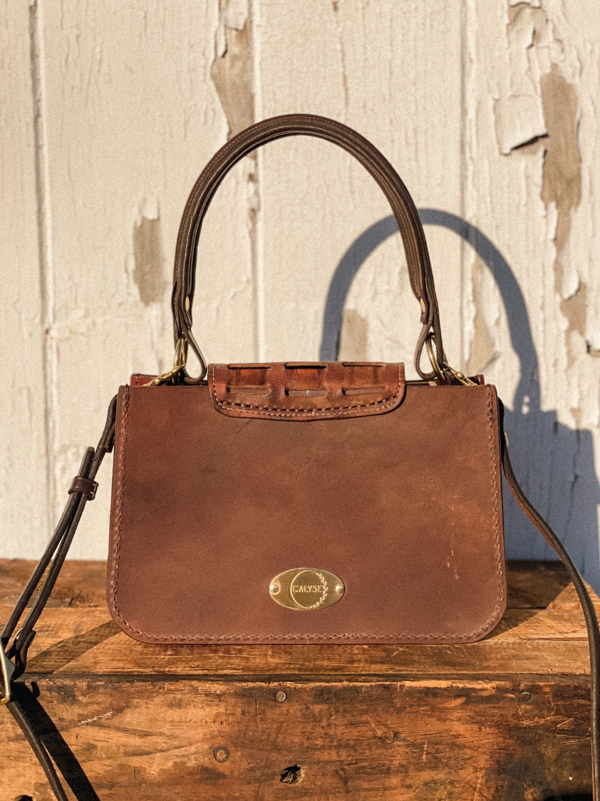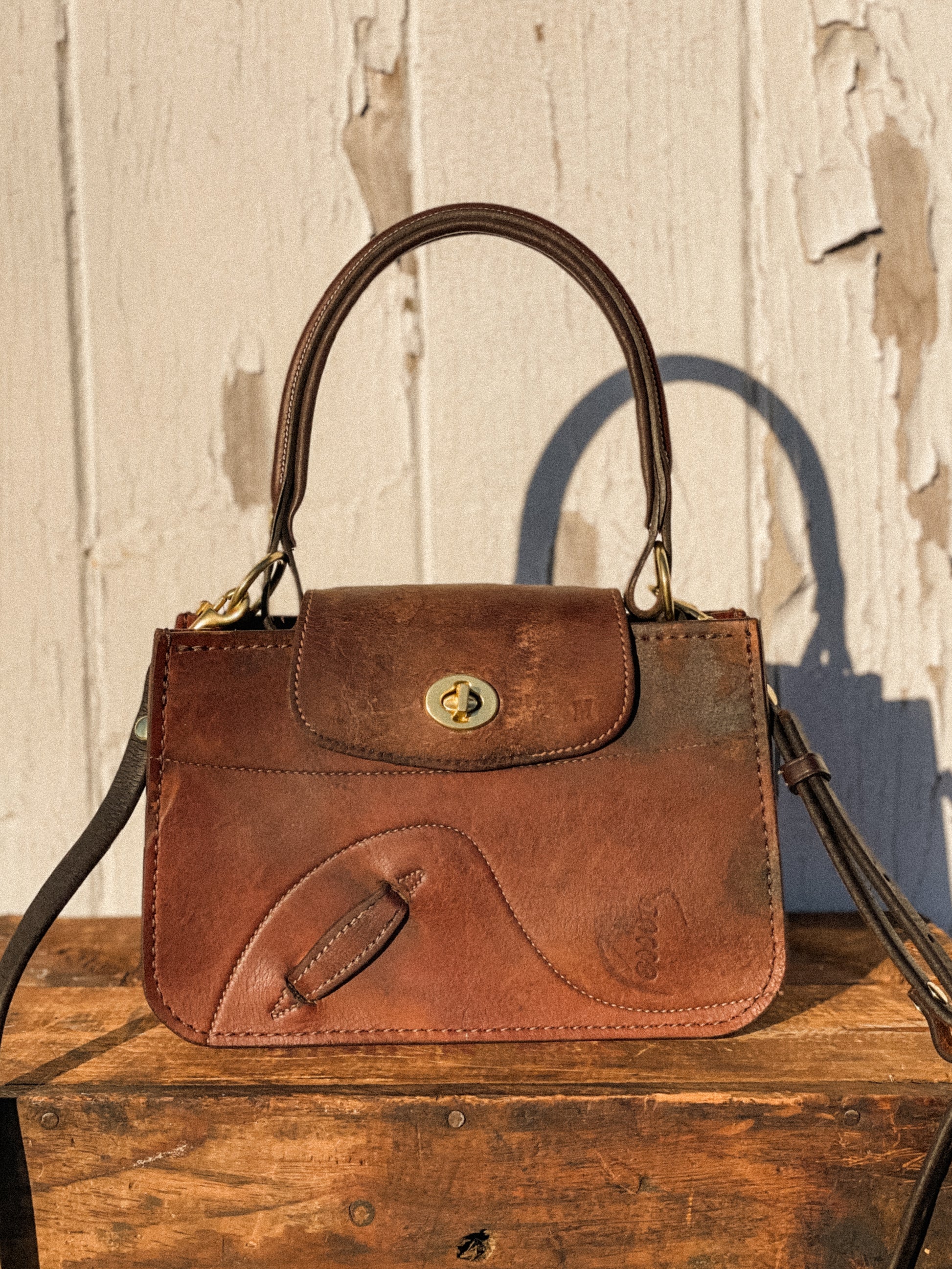 Hadley is where chic style and the character of handmade saddle bag meets. This petite handbag can be worn from day to night. Featuring a turnbuckle closure set into a repurposed billet guard, brow band handle and detachable rein strap. Complete with an interior snapped pocket. Edges are finished and sealed with beeswax for longevity.