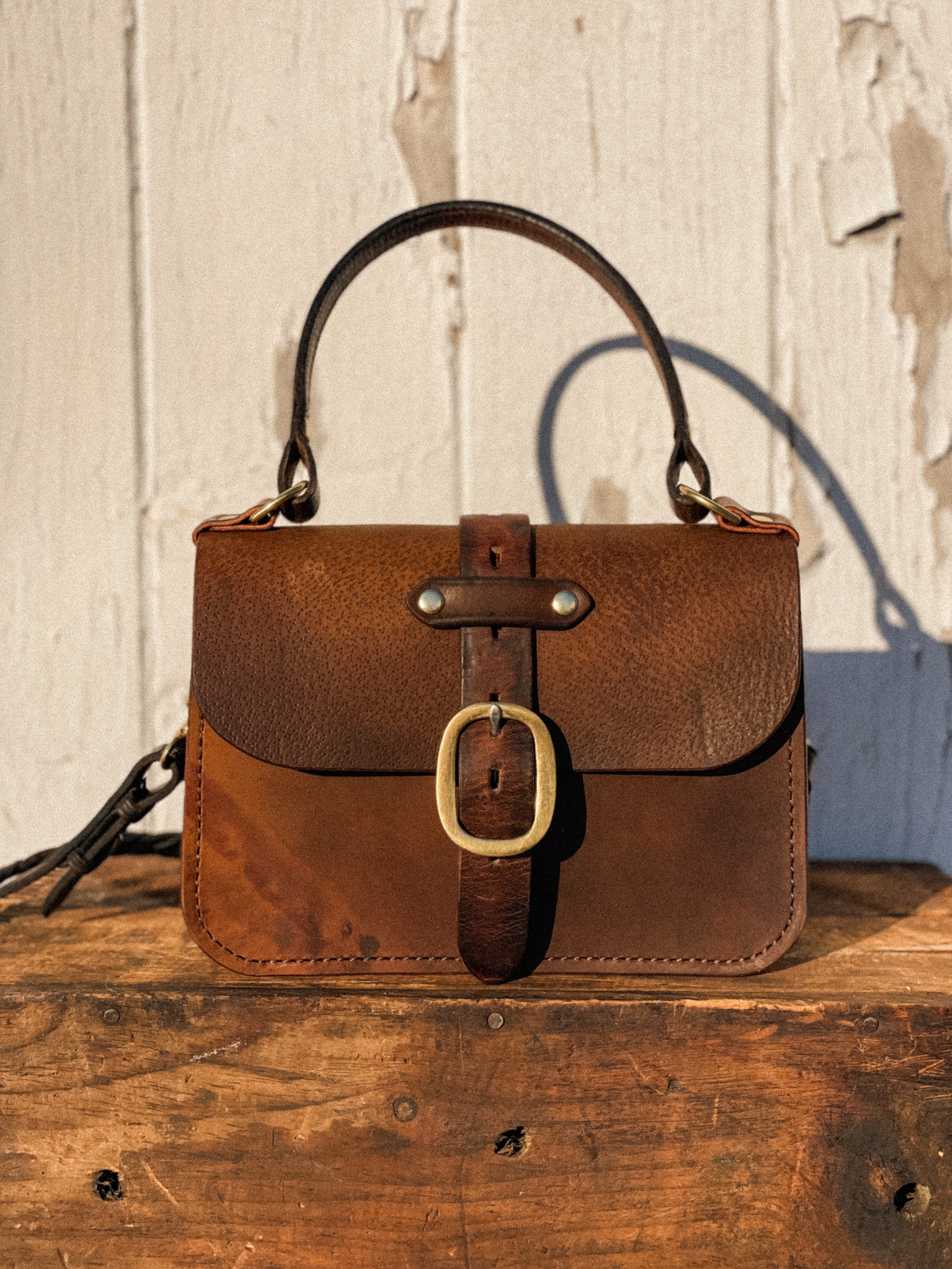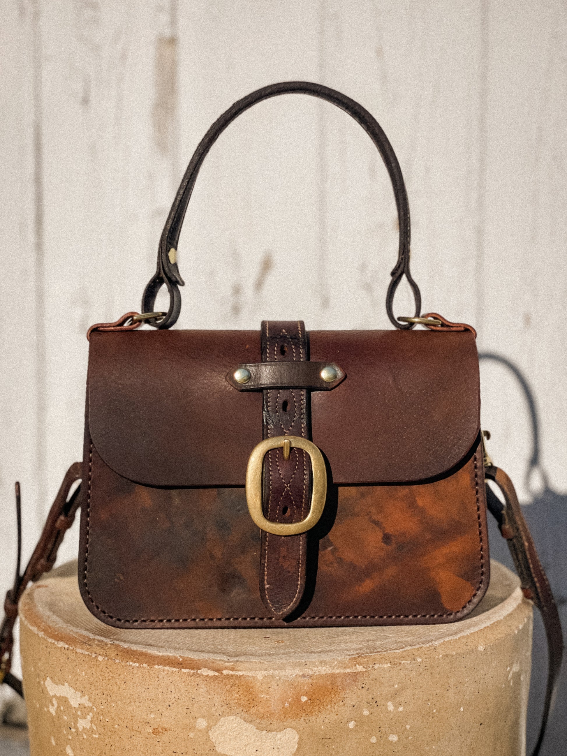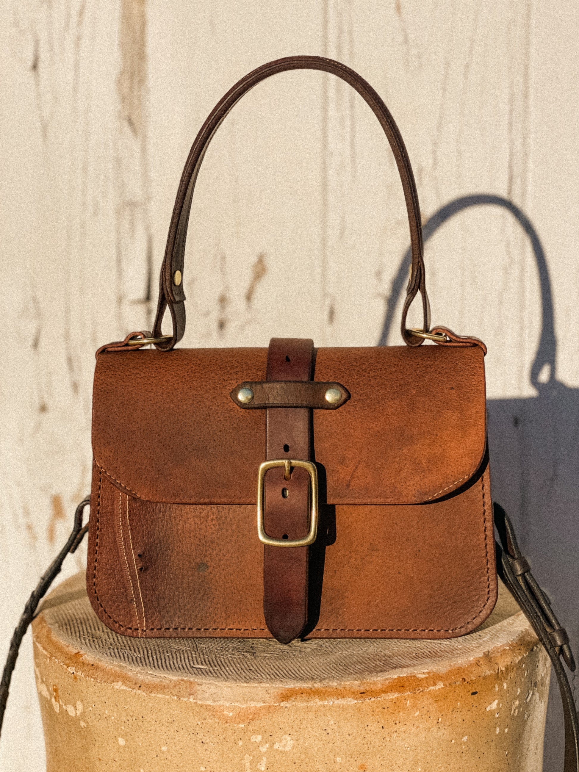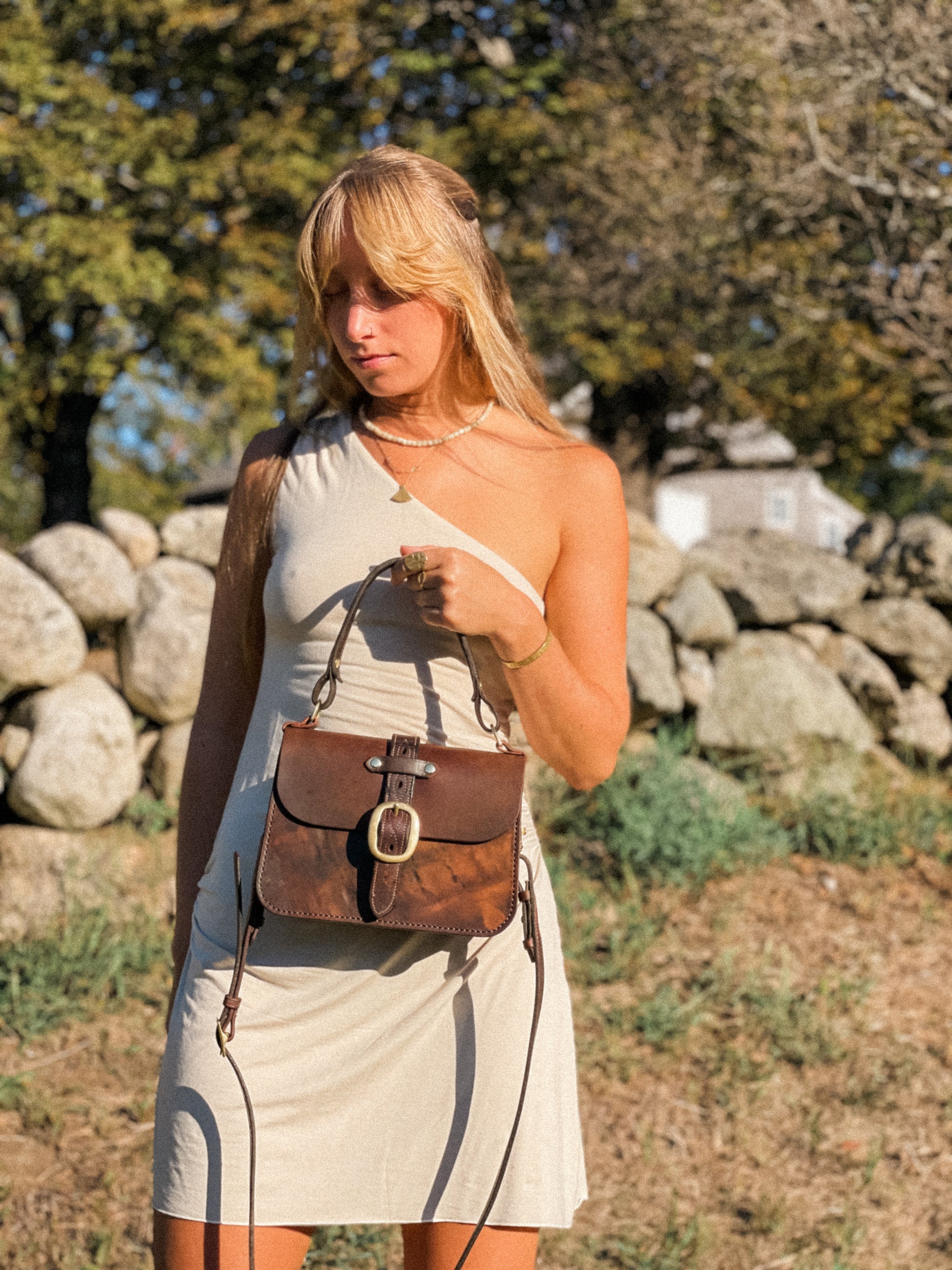 Inspired heavily by its equestrian origin. A sense of tacking up to head on your journey. It’s classic shape, the structured feel of it’s repurposed saddle leather and natural brass fittings pay homage to the quality and style found in equestrian equipment. The Oldenburg features a flap closure secured by a magnetic snapped buckle. The exterior phone holster keeps your phone snug yet close to access. Finished with a detachable crossbody strap and snapped interior pocket. The character is endless. Edges are finished and seal with beeswax for longevity.