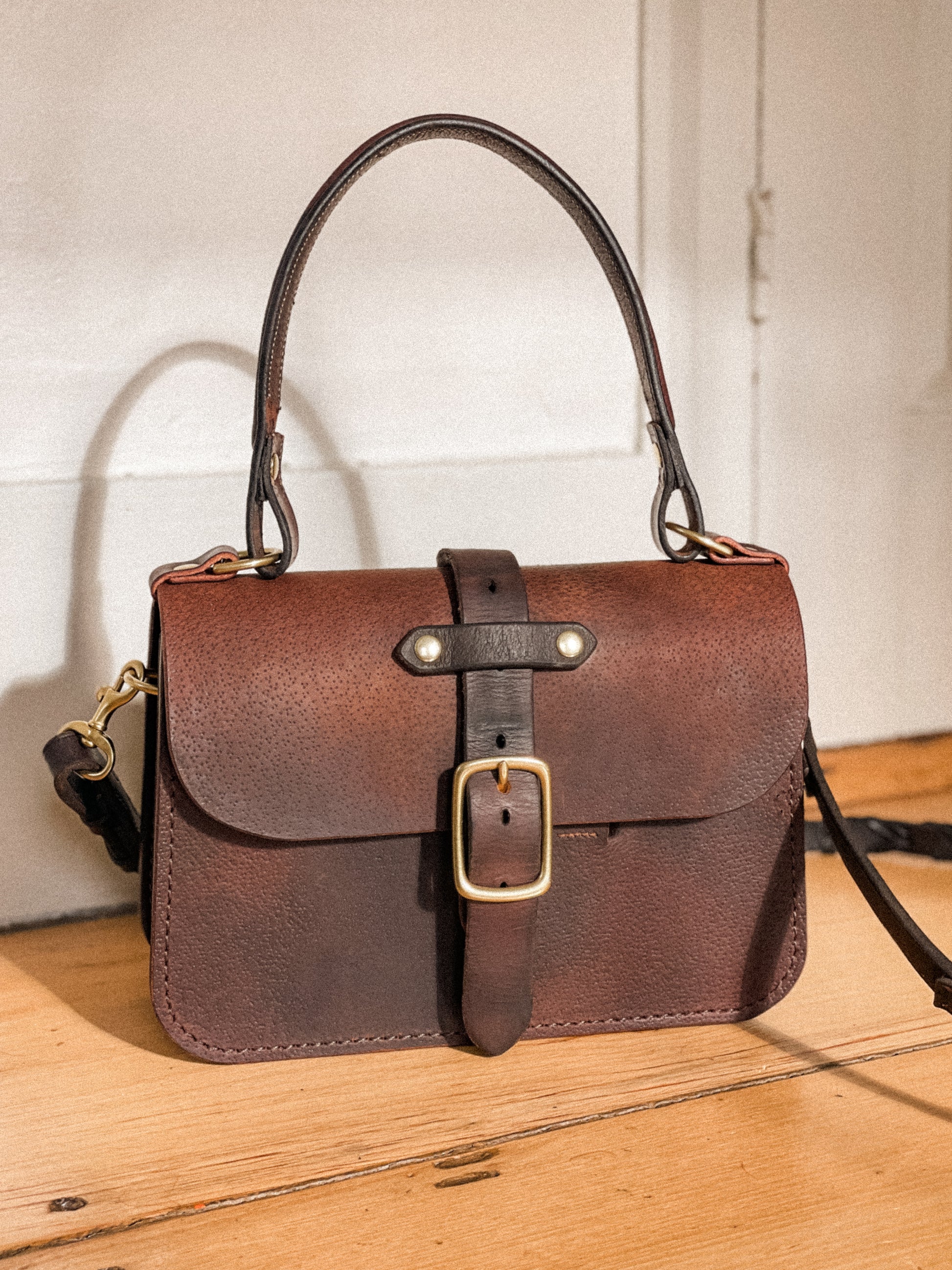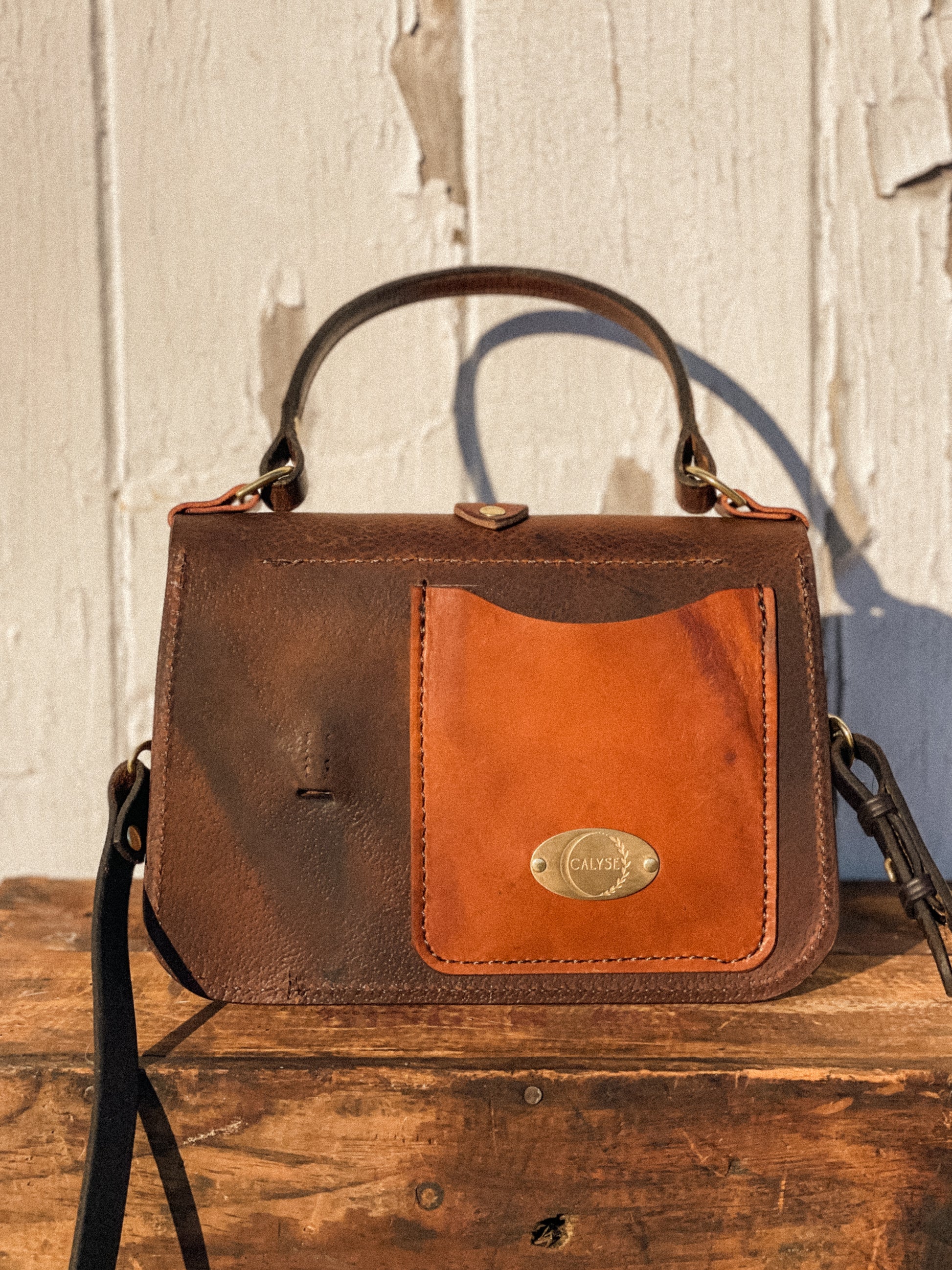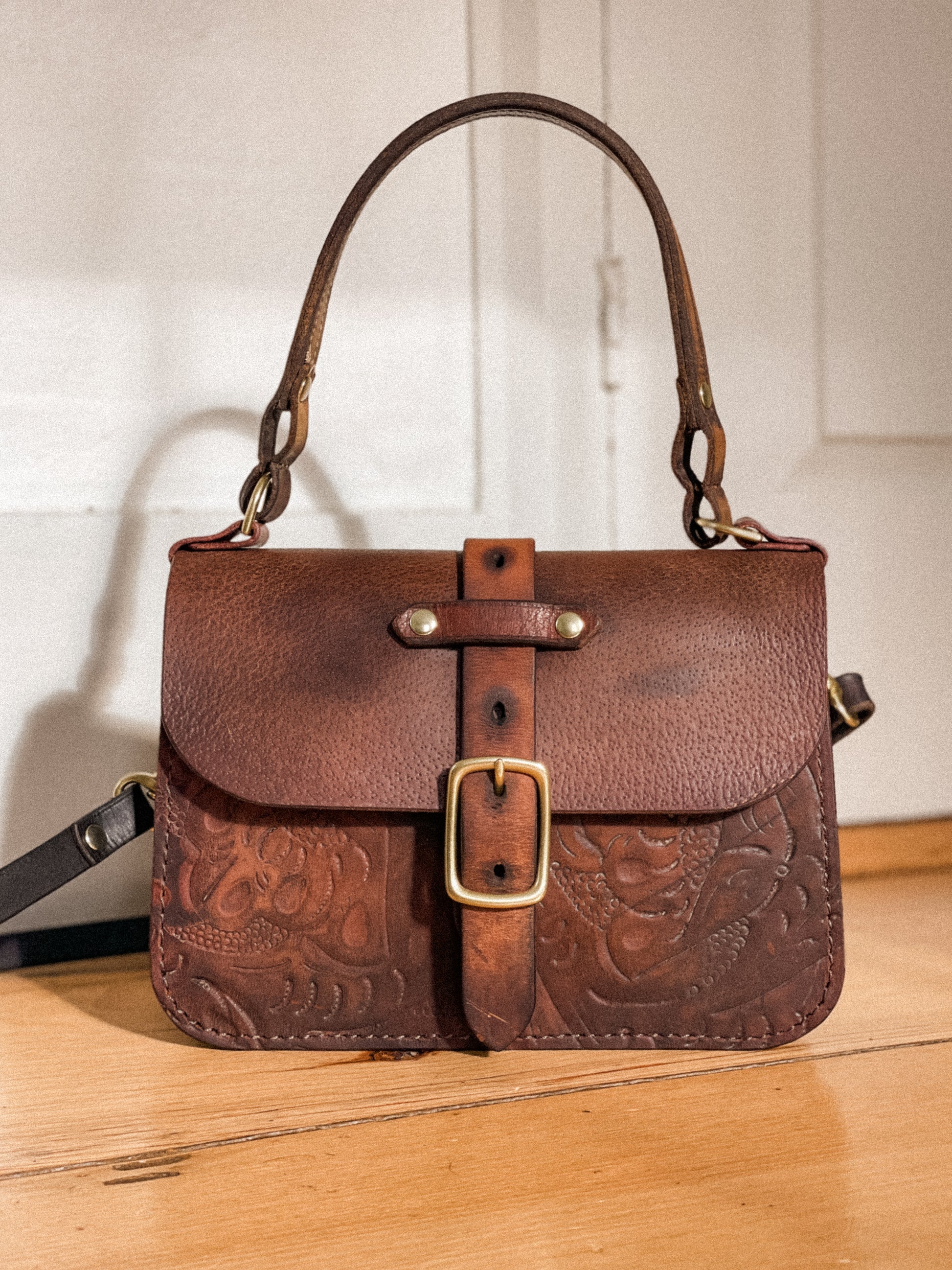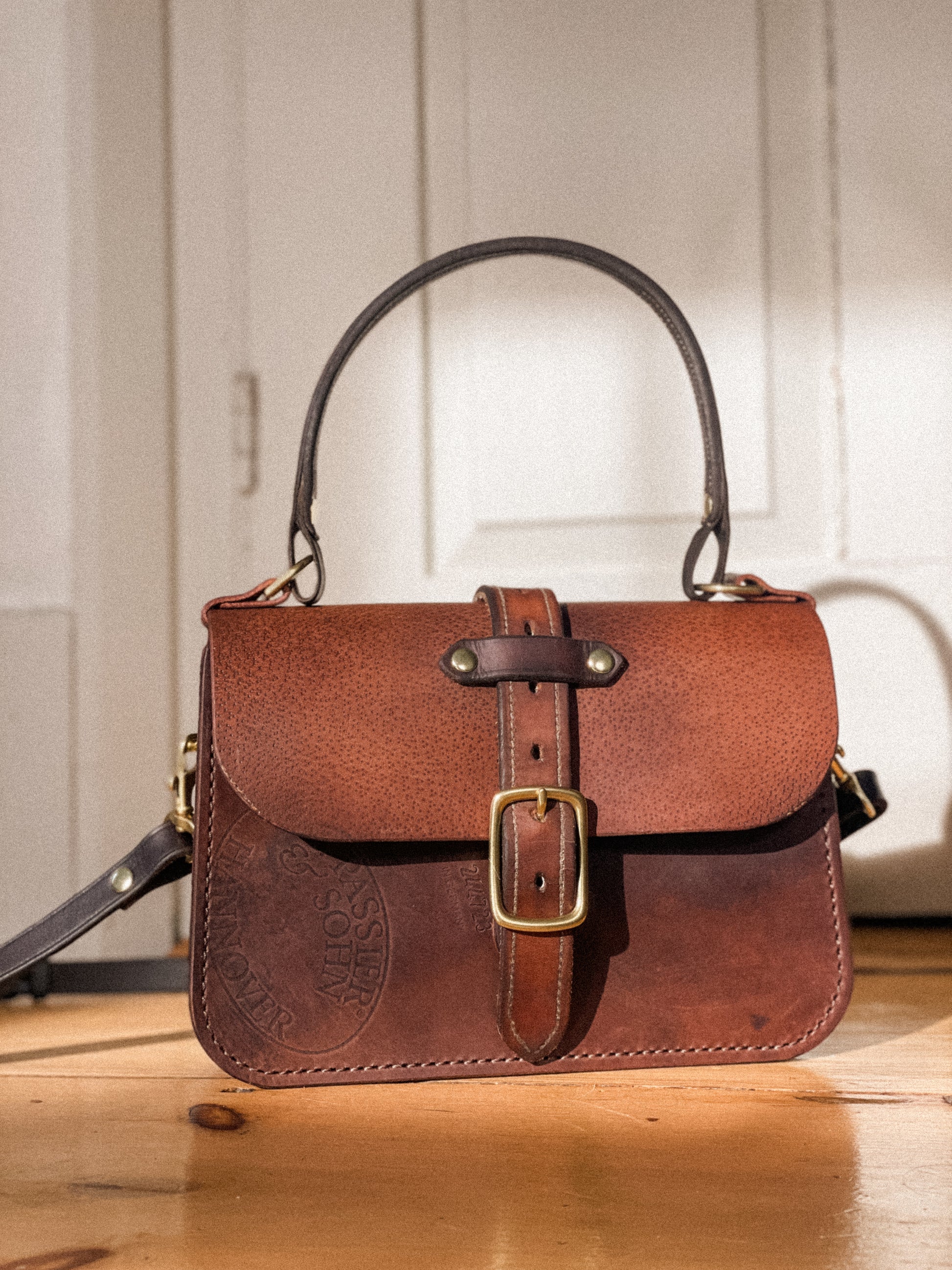 Inspired heavily by its equestrian origin. A sense of tacking up to head on your journey. It’s classic shape, the structured feel of it’s repurposed saddle leather and natural brass fittings pay homage to the quality and style found in equestrian equipment. The Oldenburg features a flap closure secured by a magnetic snapped buckle. The exterior phone holster keeps your phone snug yet close to access. Finished with a detachable crossbody strap and snapped interior pocket. The character is endless. Edges are finished and seal with beeswax for longevity.