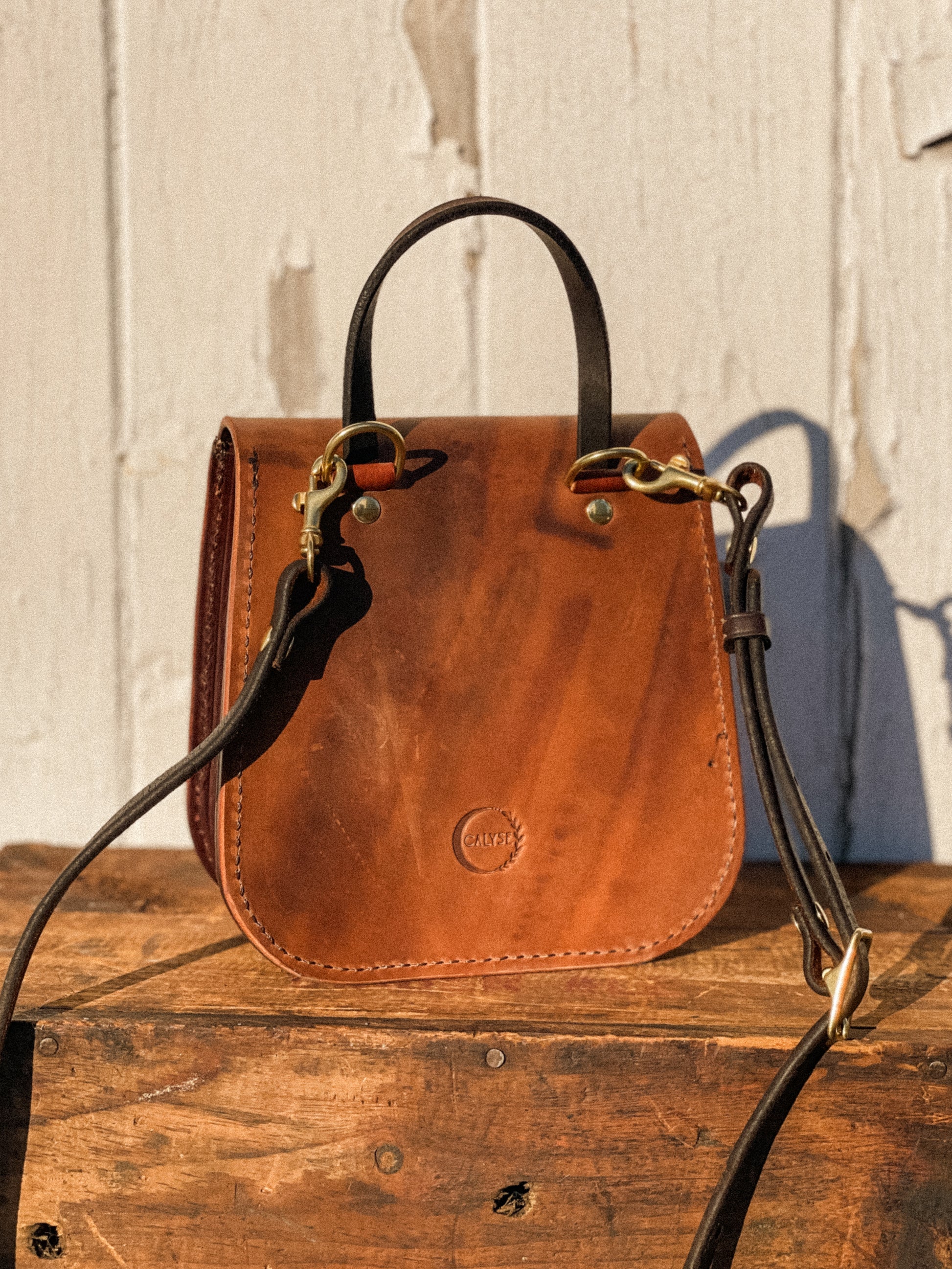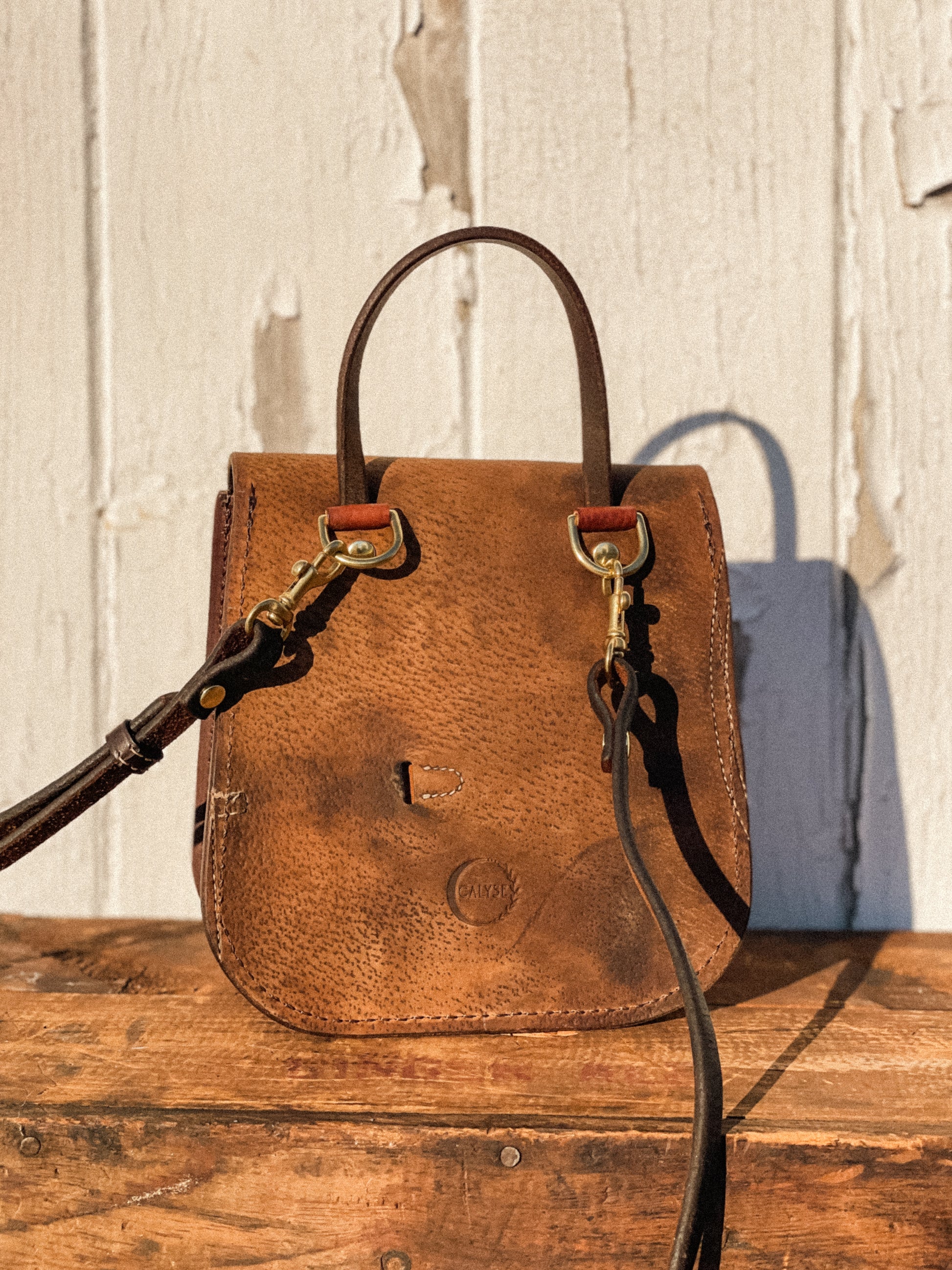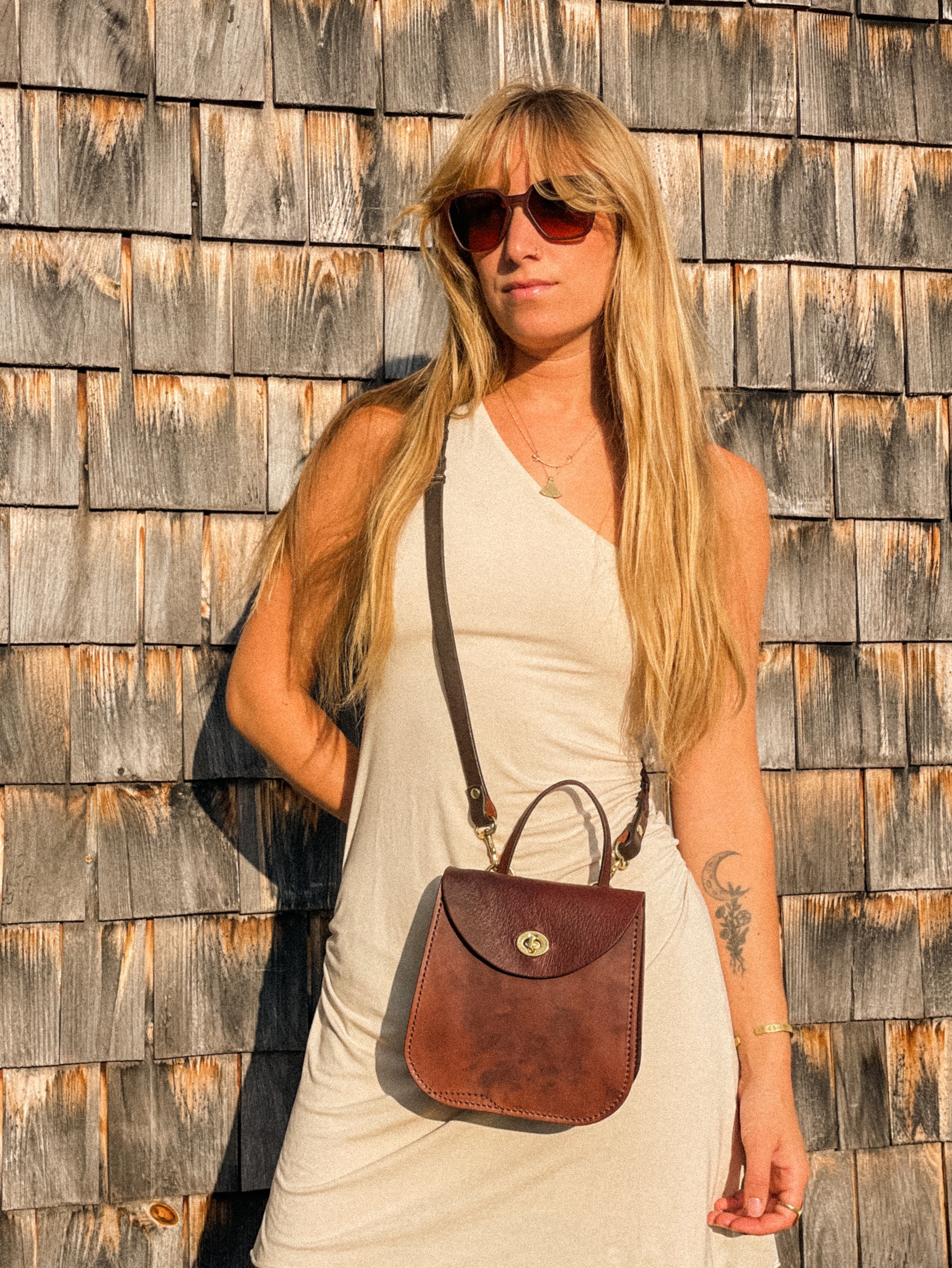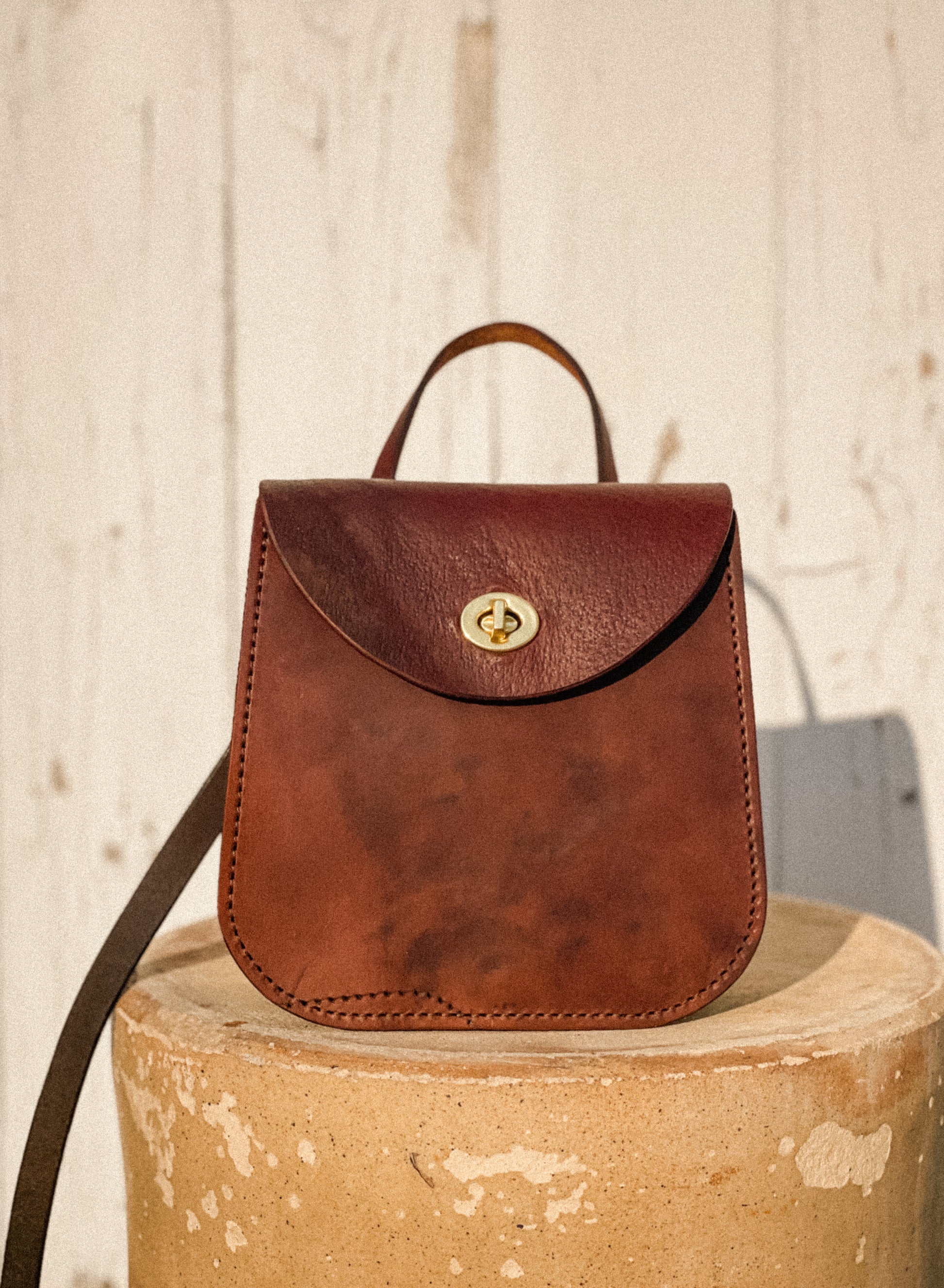 Isabella is the perfect everyday carry that can transition into a night out. Made from repurposed saddle leather, you can be sure Isabella stands out from the rest. This playful bag features a top handle for easy carrying, turnbuckle latch that is secure and satisfying to use, interior slip pocket for organization and an adjustable crossbody strap made from repurposed tack.