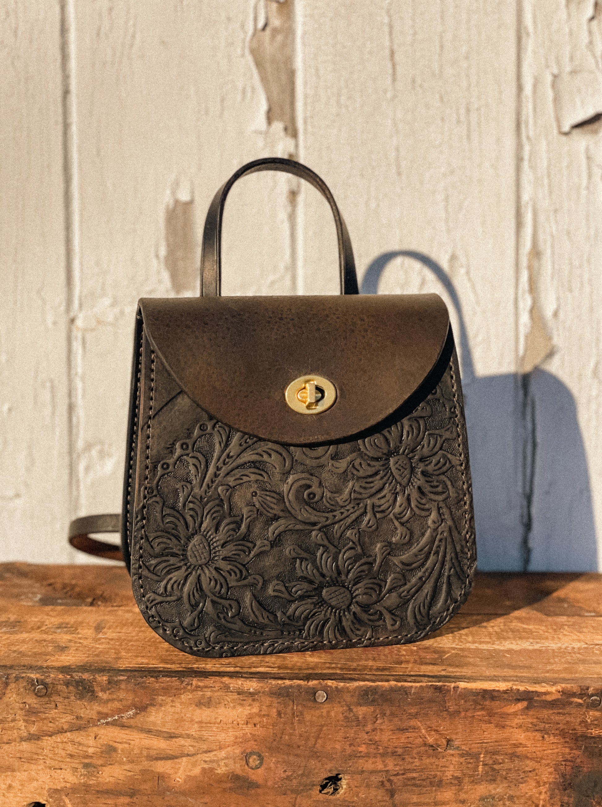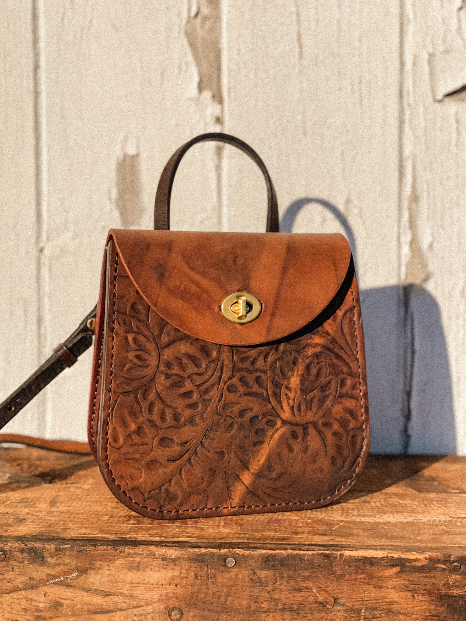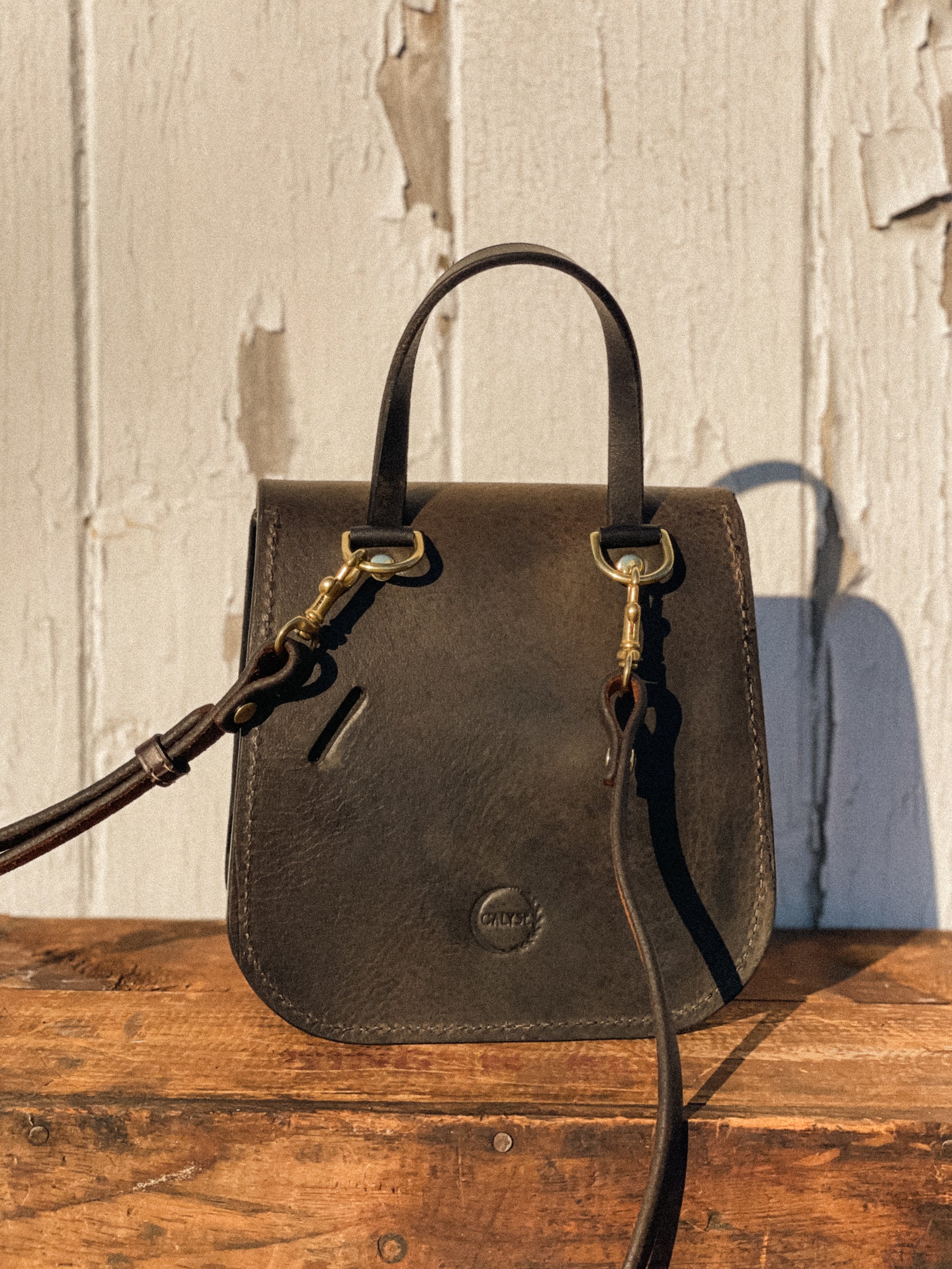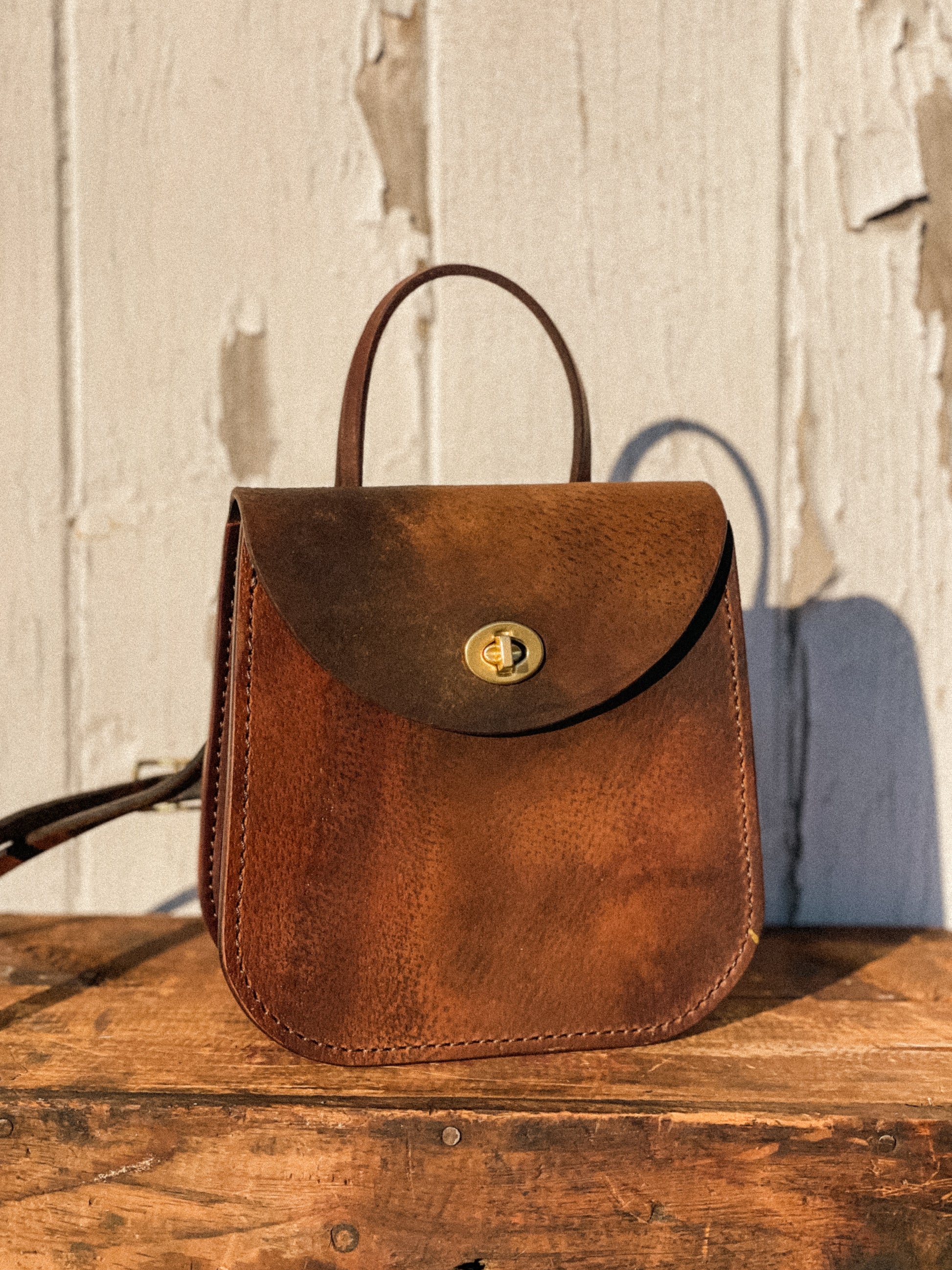 Isabella is the perfect everyday carry that can transition into a night out. Made from repurposed saddle leather, you can be sure Isabella stands out from the rest. This playful bag features a top handle for easy carrying, turnbuckle latch that is secure and satisfying to use, interior slip pocket for organization and an adjustable crossbody strap made from repurposed tack.