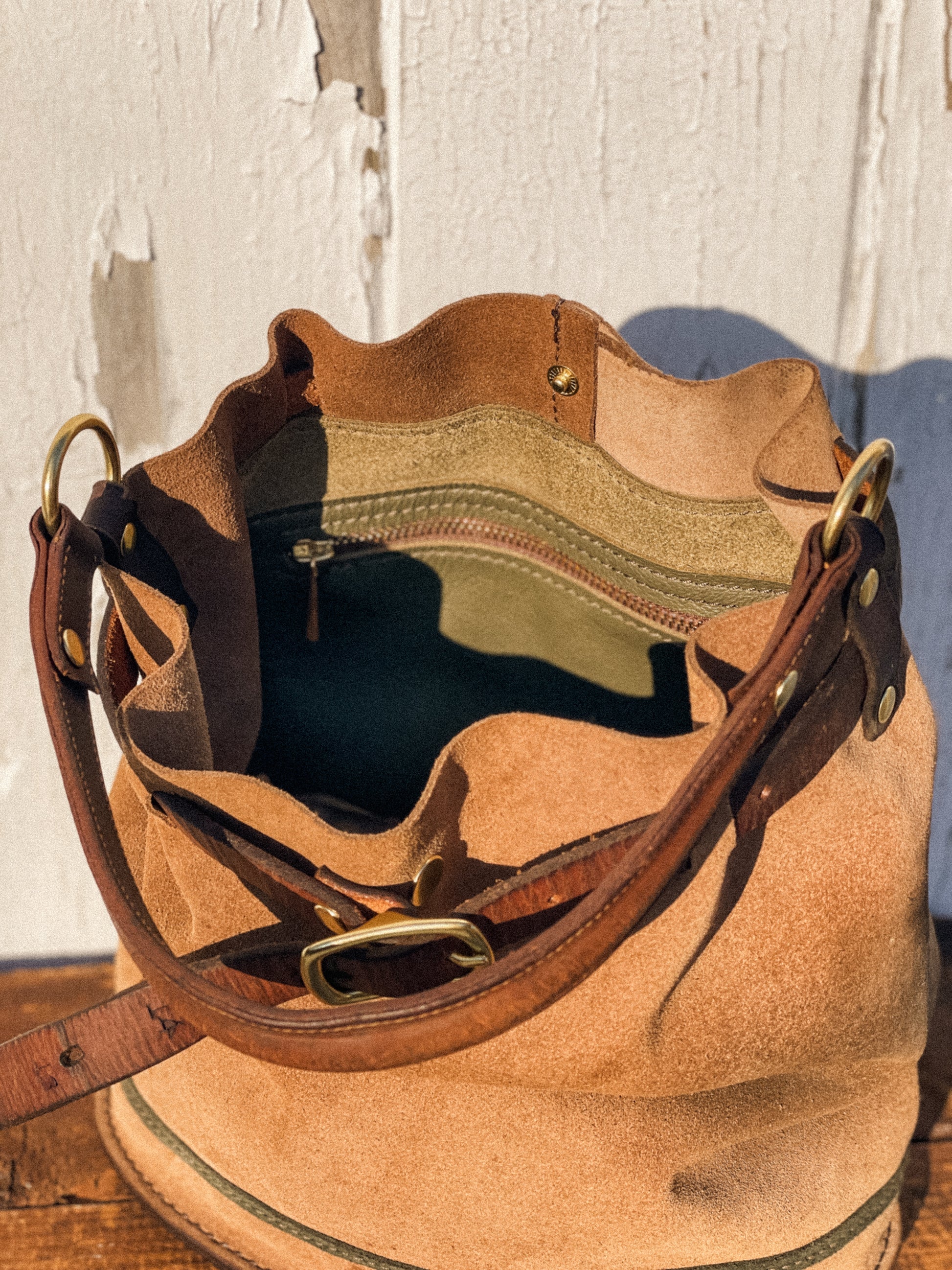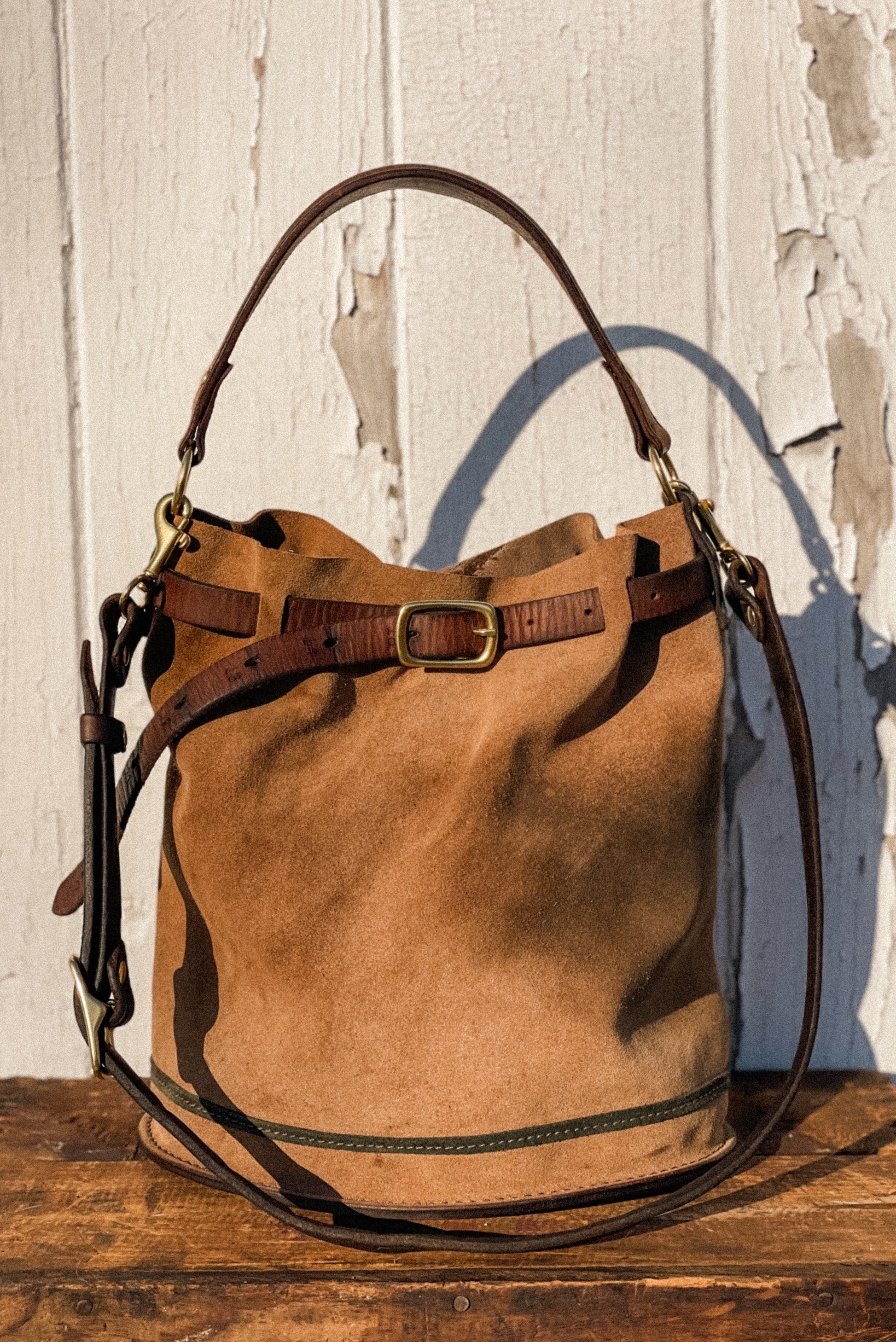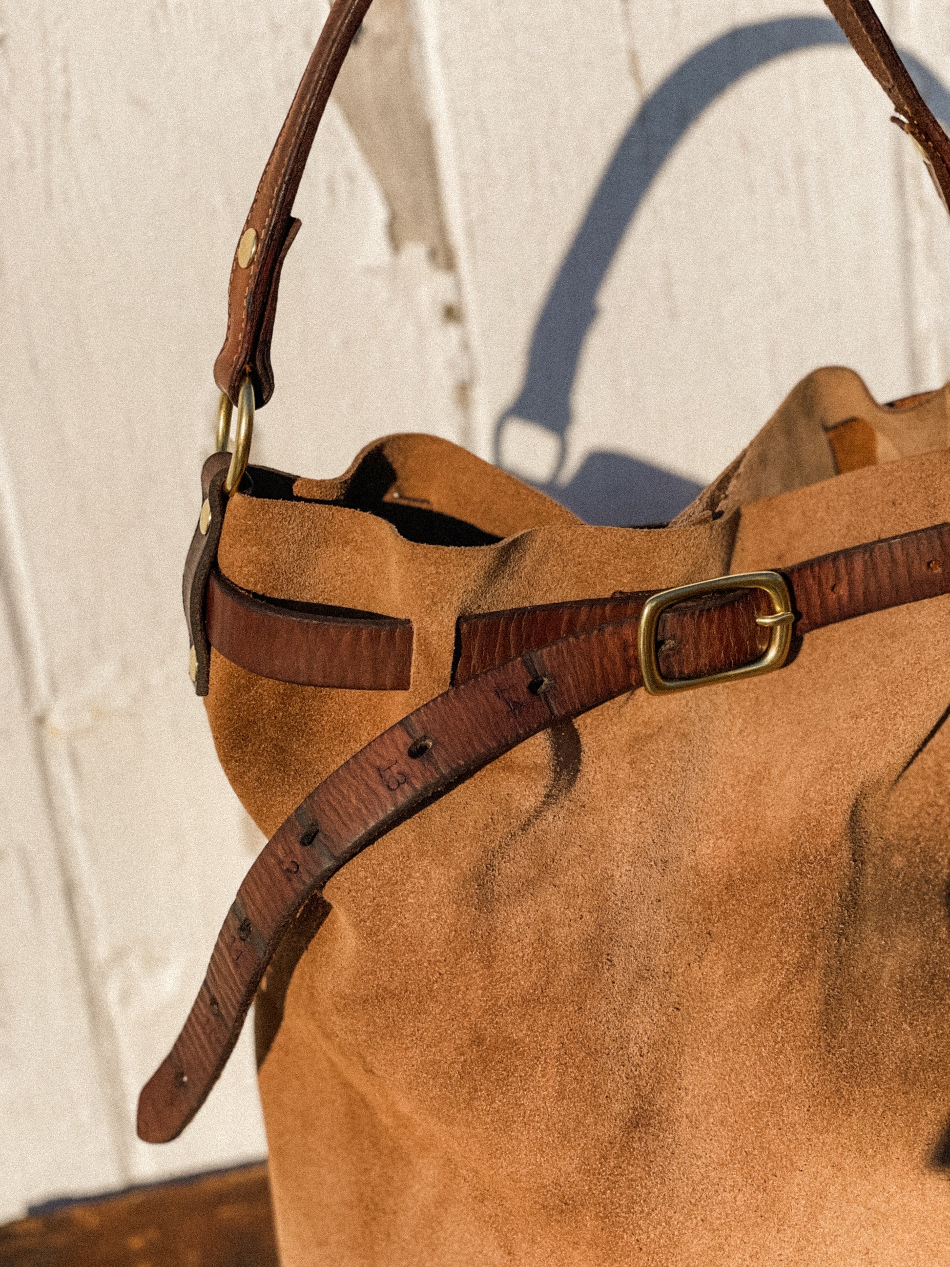 The Jojo bucket bag is crafted from repurposed suede chaps, paired with a saddle leather bottom with brass feet for a structured base. The belted top has a cinched effect that is adjustable to your liking and secured by a hidden snap. Complete with an interior zippered pocket, brow band carry handle and detachable shoulder strap all made from repurposed tack. Finished with solid brass hardware.