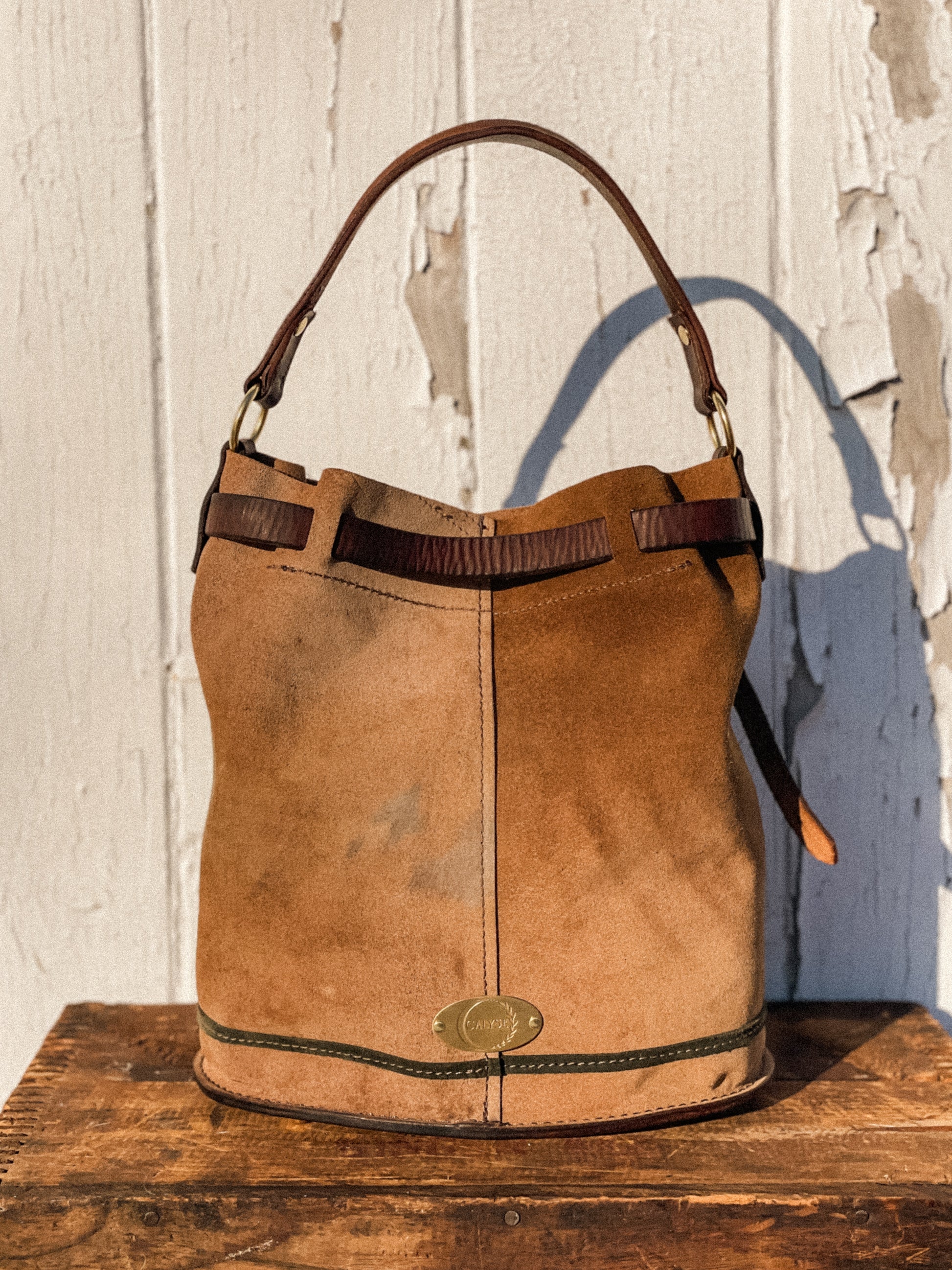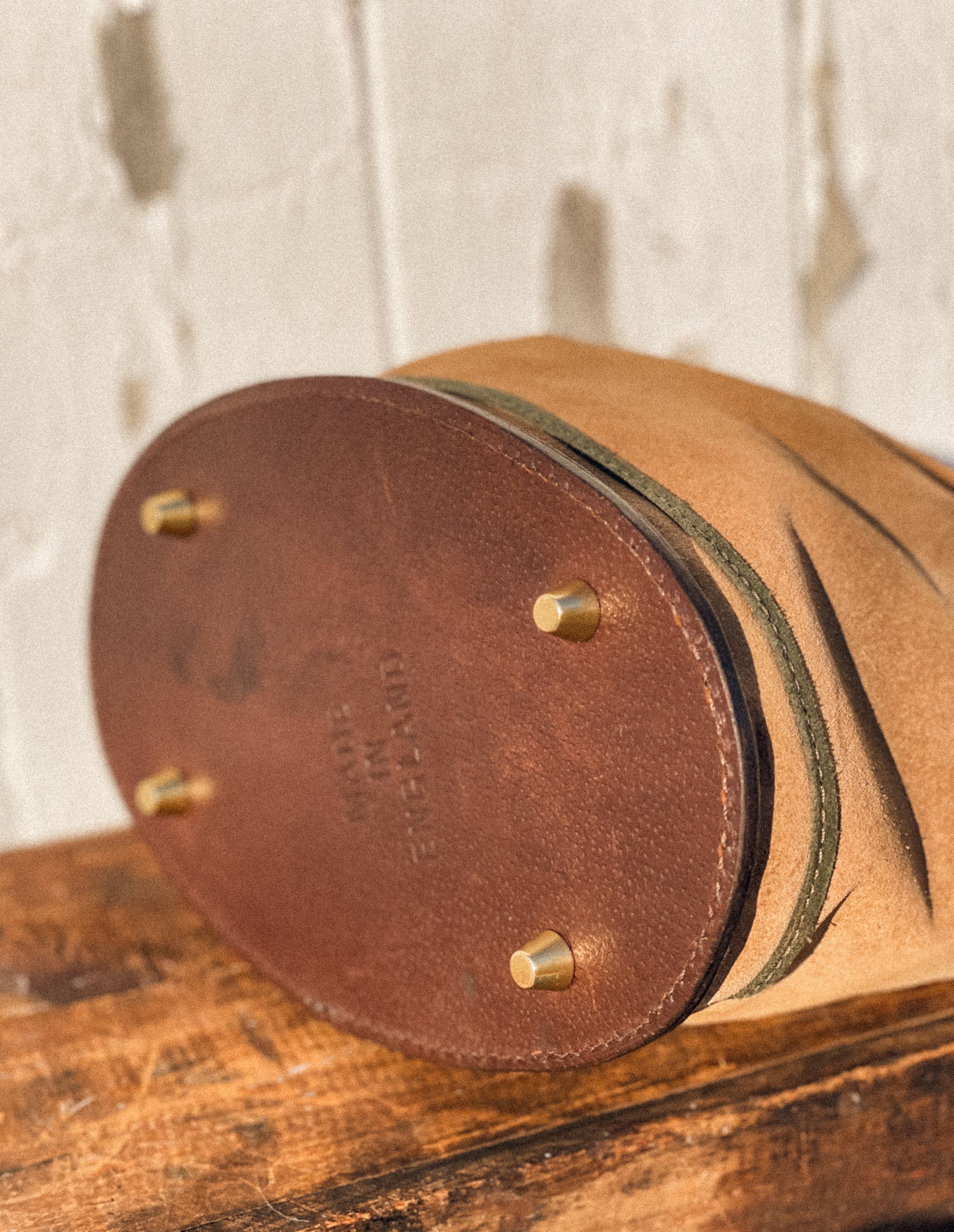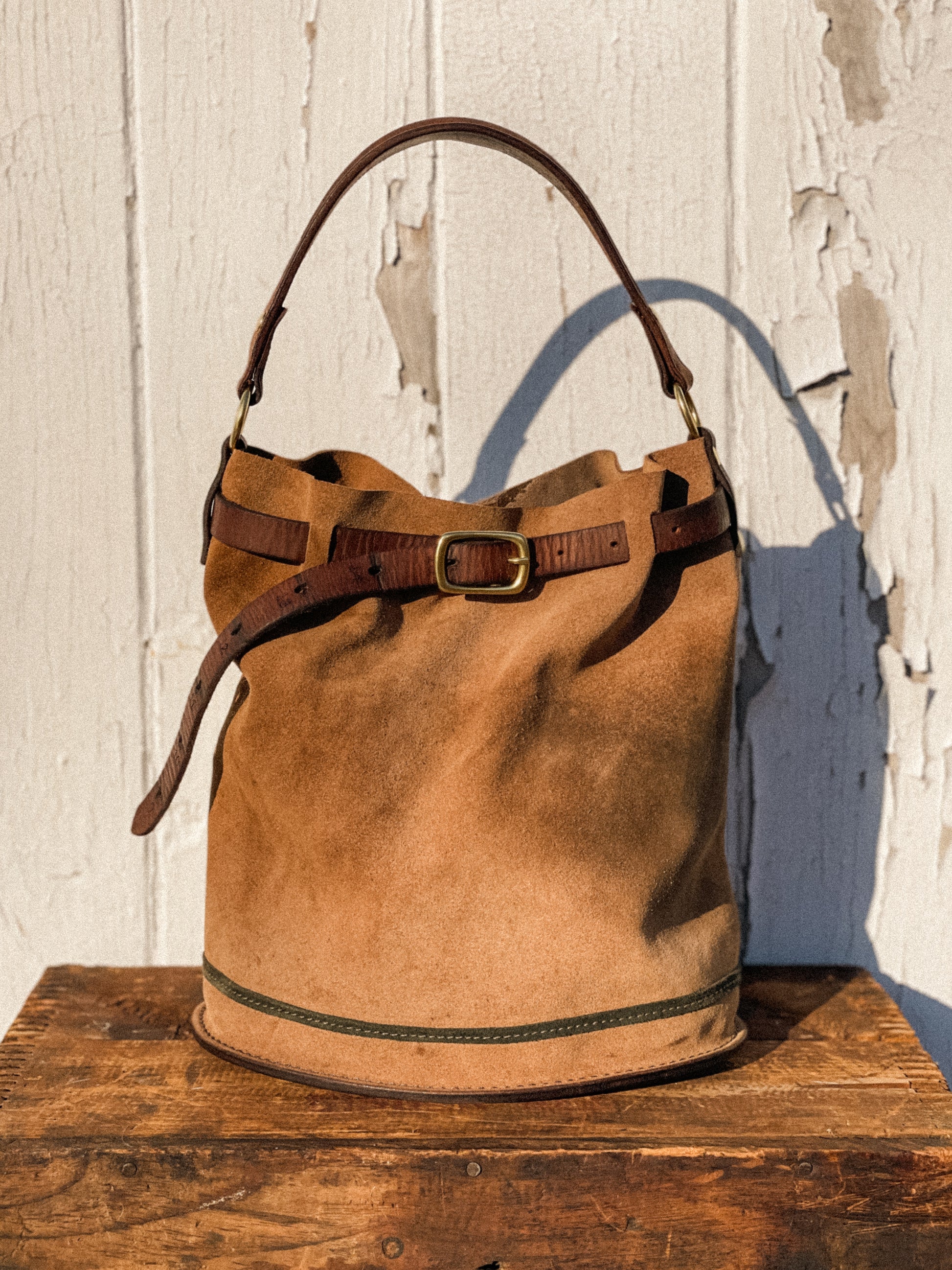 The Jojo bucket bag is crafted from repurposed suede chaps, paired with a saddle leather bottom with brass feet for a structured base. The belted top has a cinched effect that is adjustable to your liking and secured by a hidden snap. Complete with an interior zippered pocket, brow band carry handle and detachable shoulder strap all made from repurposed tack. Finished with solid brass hardware.