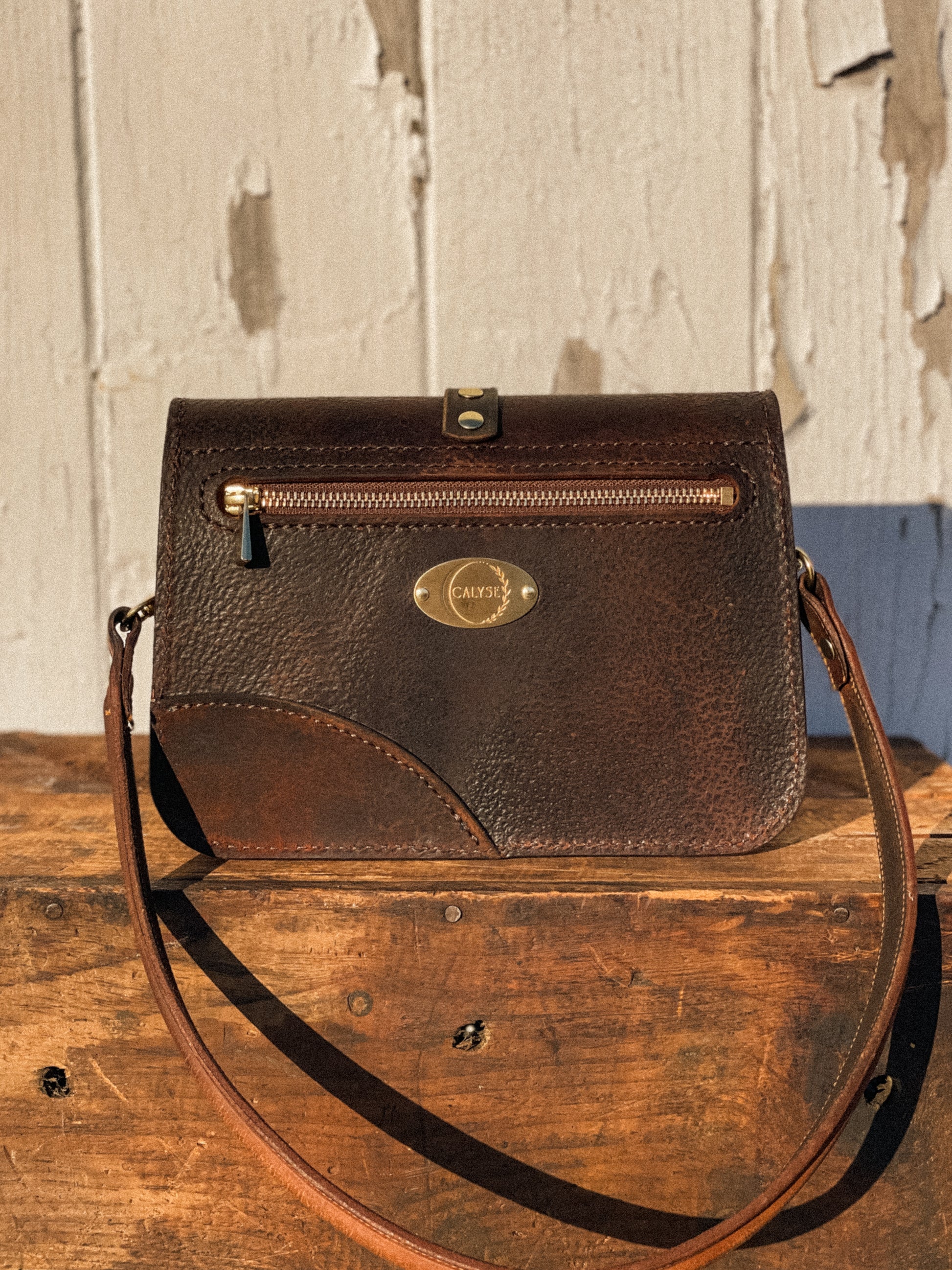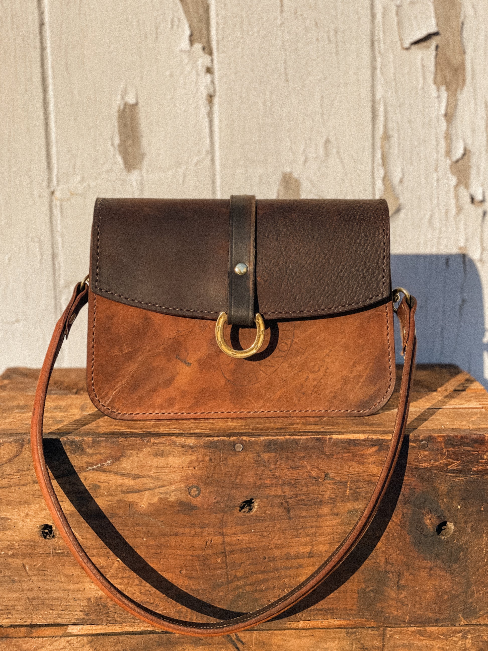 Kismet is charming and elegant with its petite size and sleek silhouette. Made from repurposed saddle leather this bag is structured and full of character. Featuring a vintage repurposed horse shoe adornment, magnetic snap closure, exterior zipper pocket interior pocket and shoulder strap. Edges are finished and sealed with beeswax for longevity. Solid brass hardware.