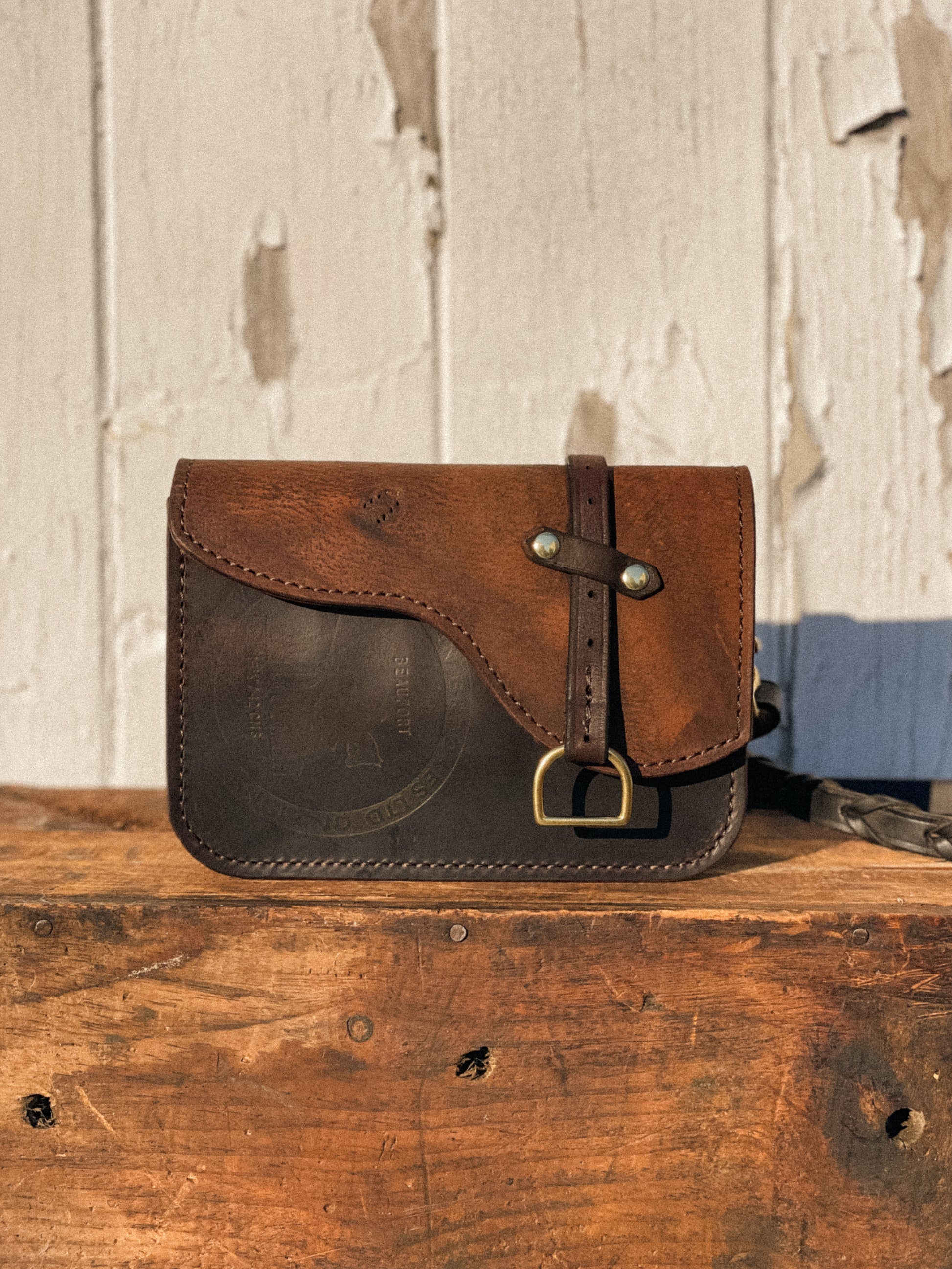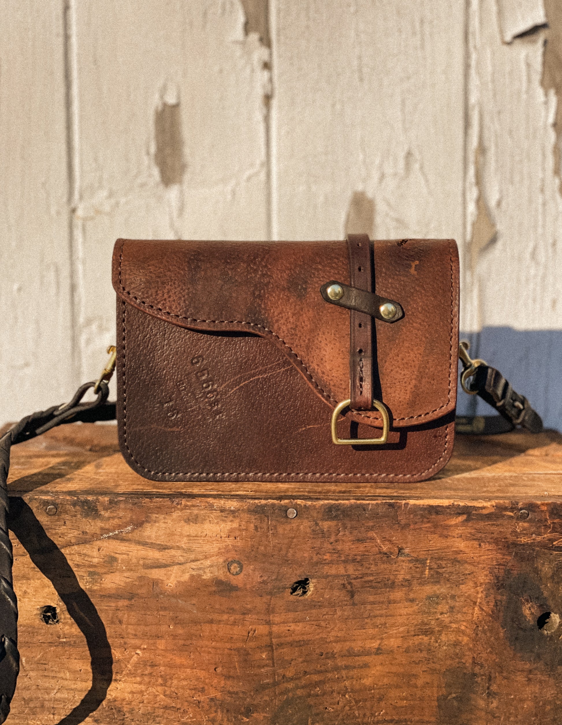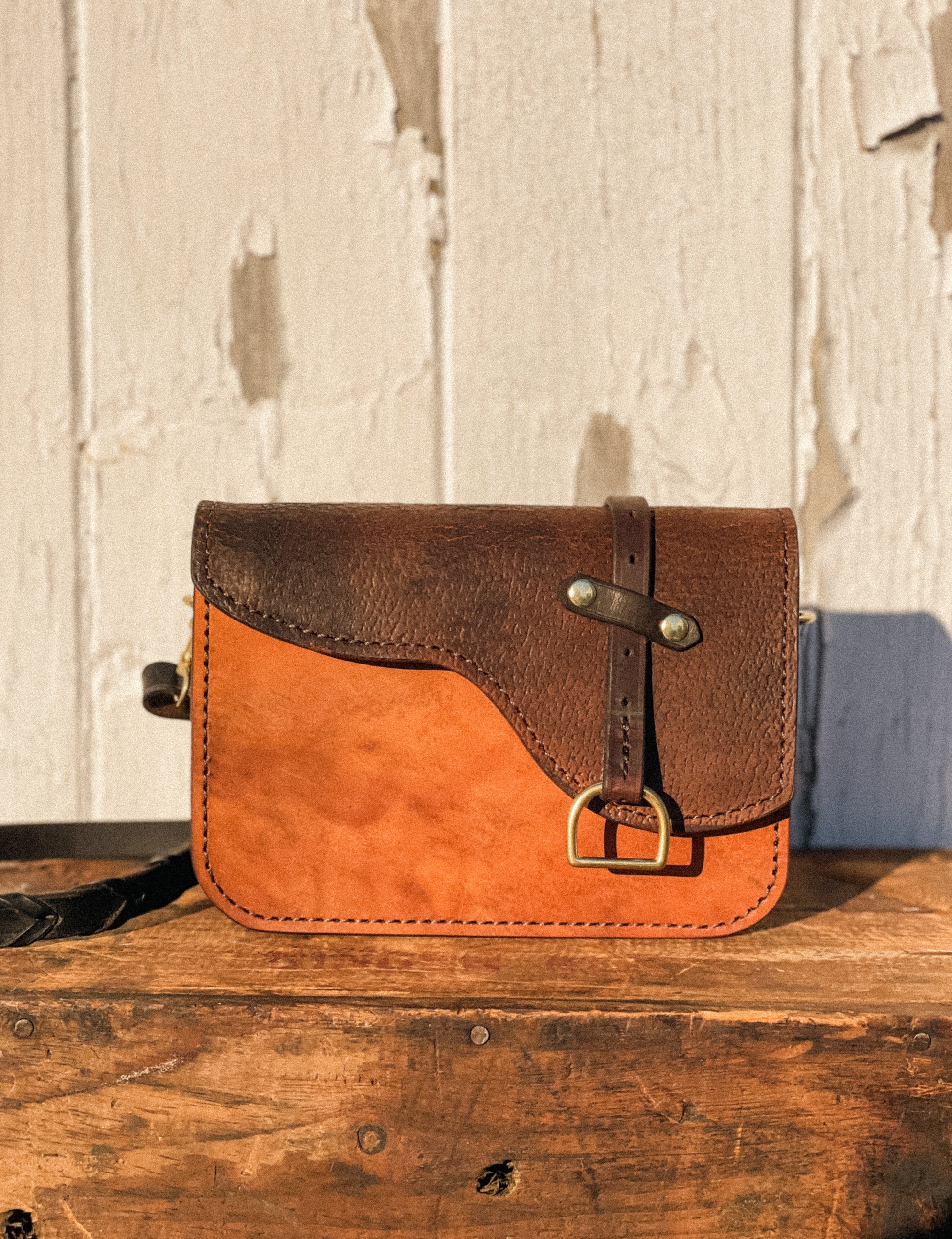 Ryder, the Mini version! Representative of it’s original form - this structured handbag made from repurposed saddle leather features a saddle shaped flap with stirrup and keeper detail. The flap is secured by two magnetic snaps. Complete with an interior pocket for smaller items. Finished in solid brass hardware and comes with your choice of a shoulder or crossbody strap made from repurposed laced reins.