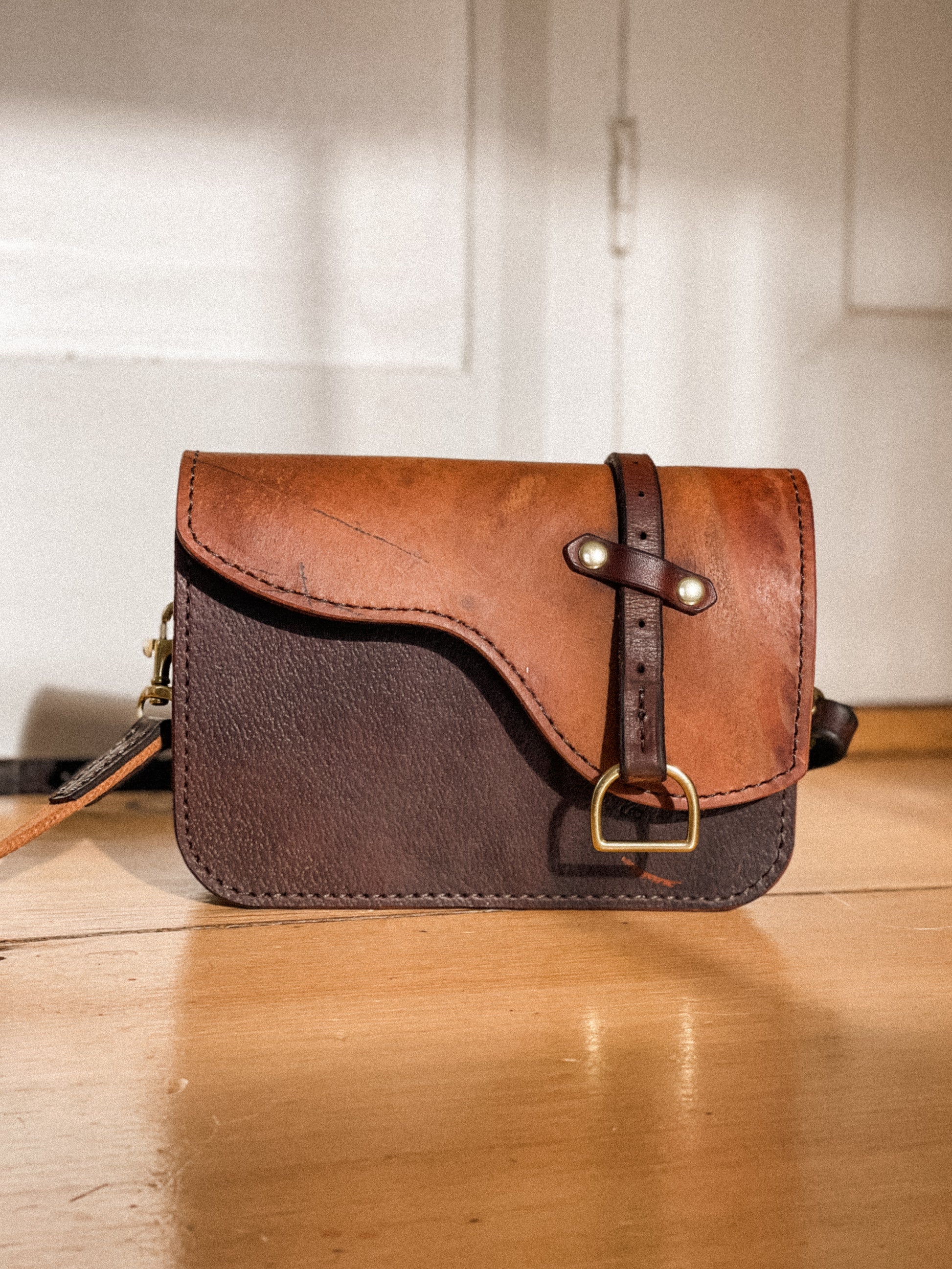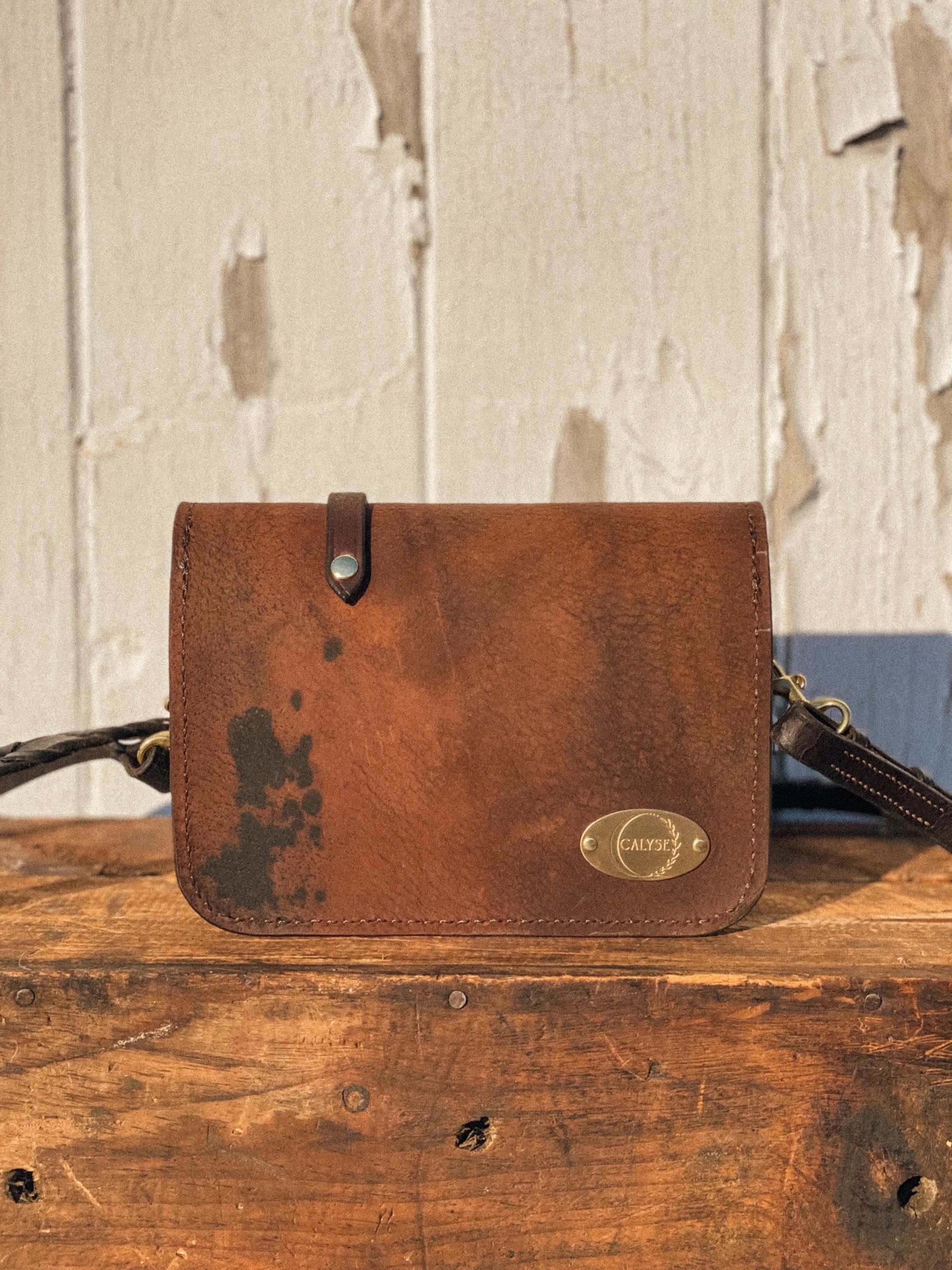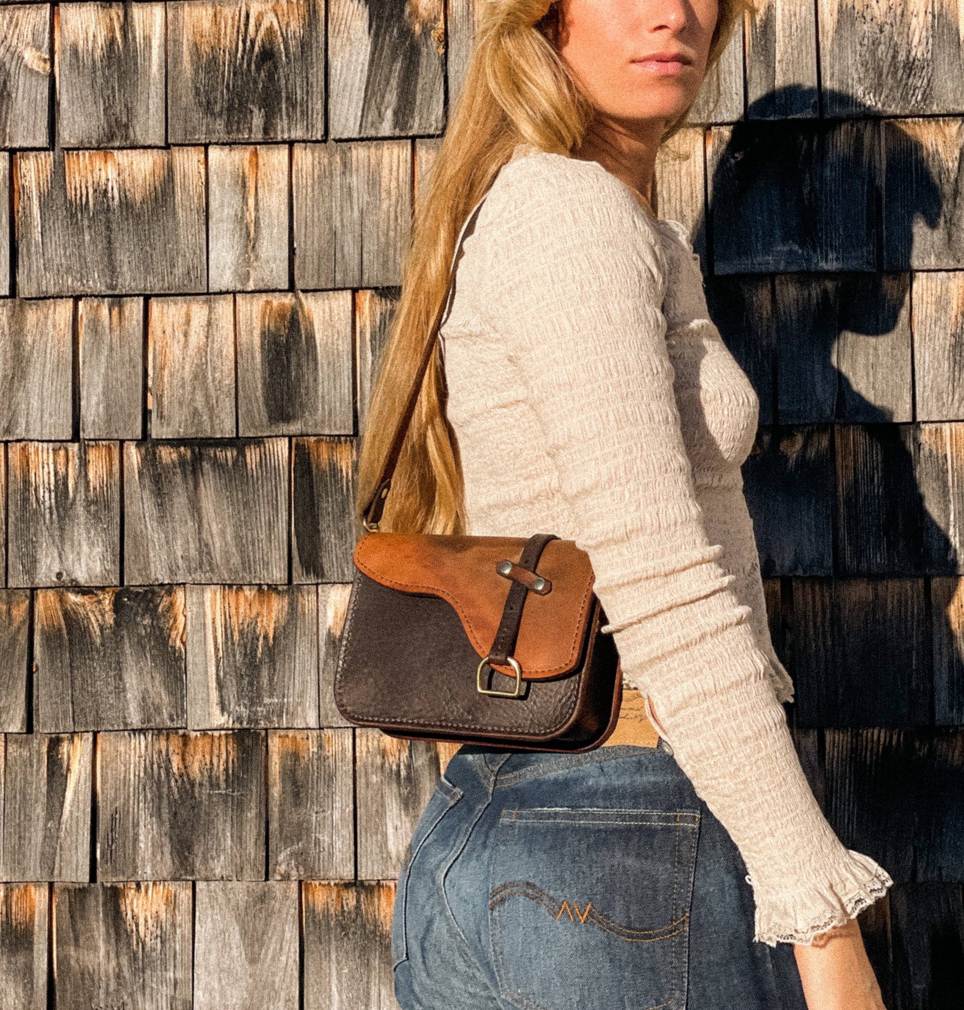 Ryder, the Mini version! Representative of it’s original form - this structured handbag made from repurposed saddle leather features a saddle shaped flap with stirrup and keeper detail. The flap is secured by two magnetic snaps. Complete with an interior pocket for smaller items. Finished in solid brass hardware and comes with your choice of a shoulder or crossbody strap made from repurposed laced reins.