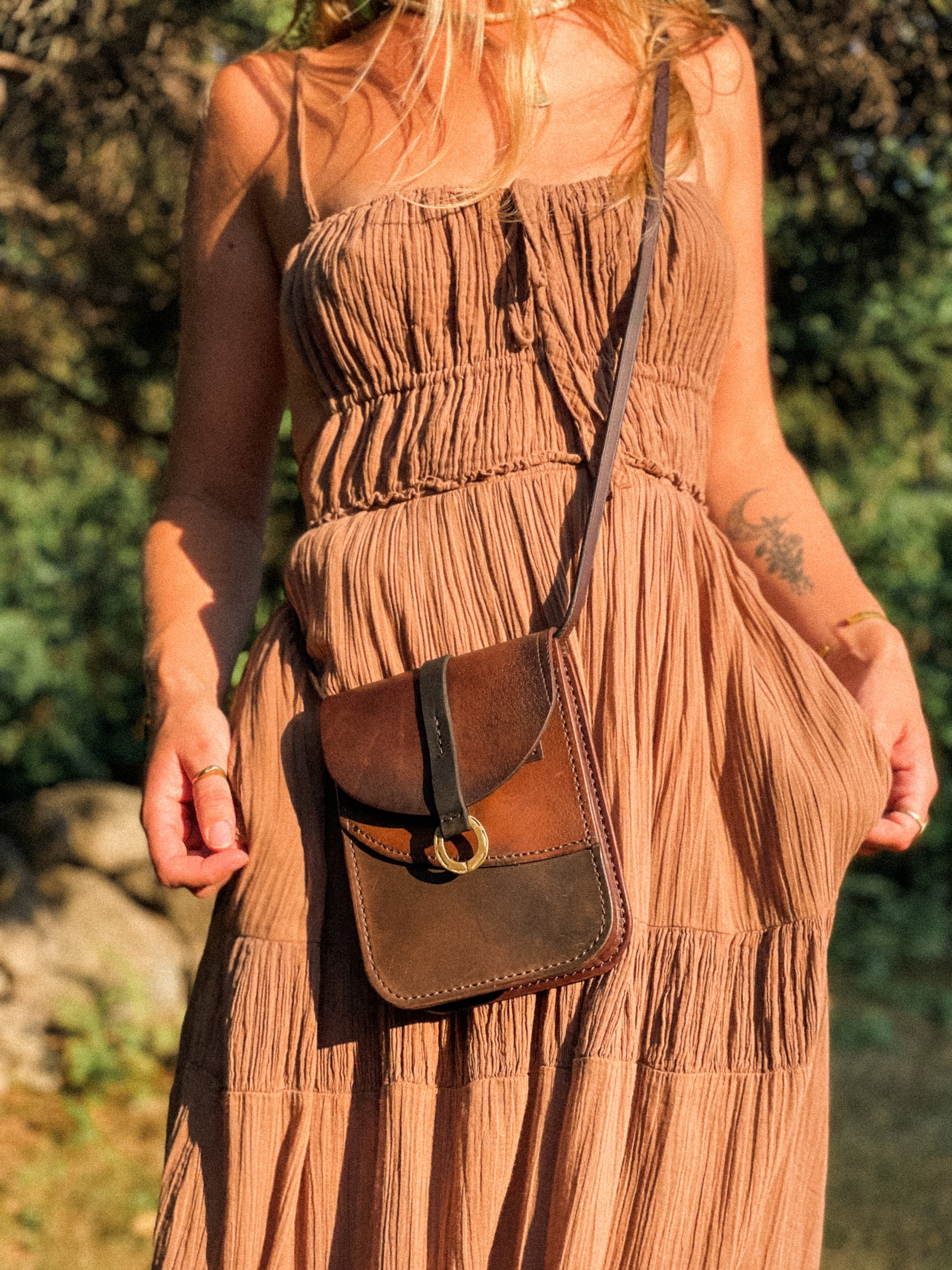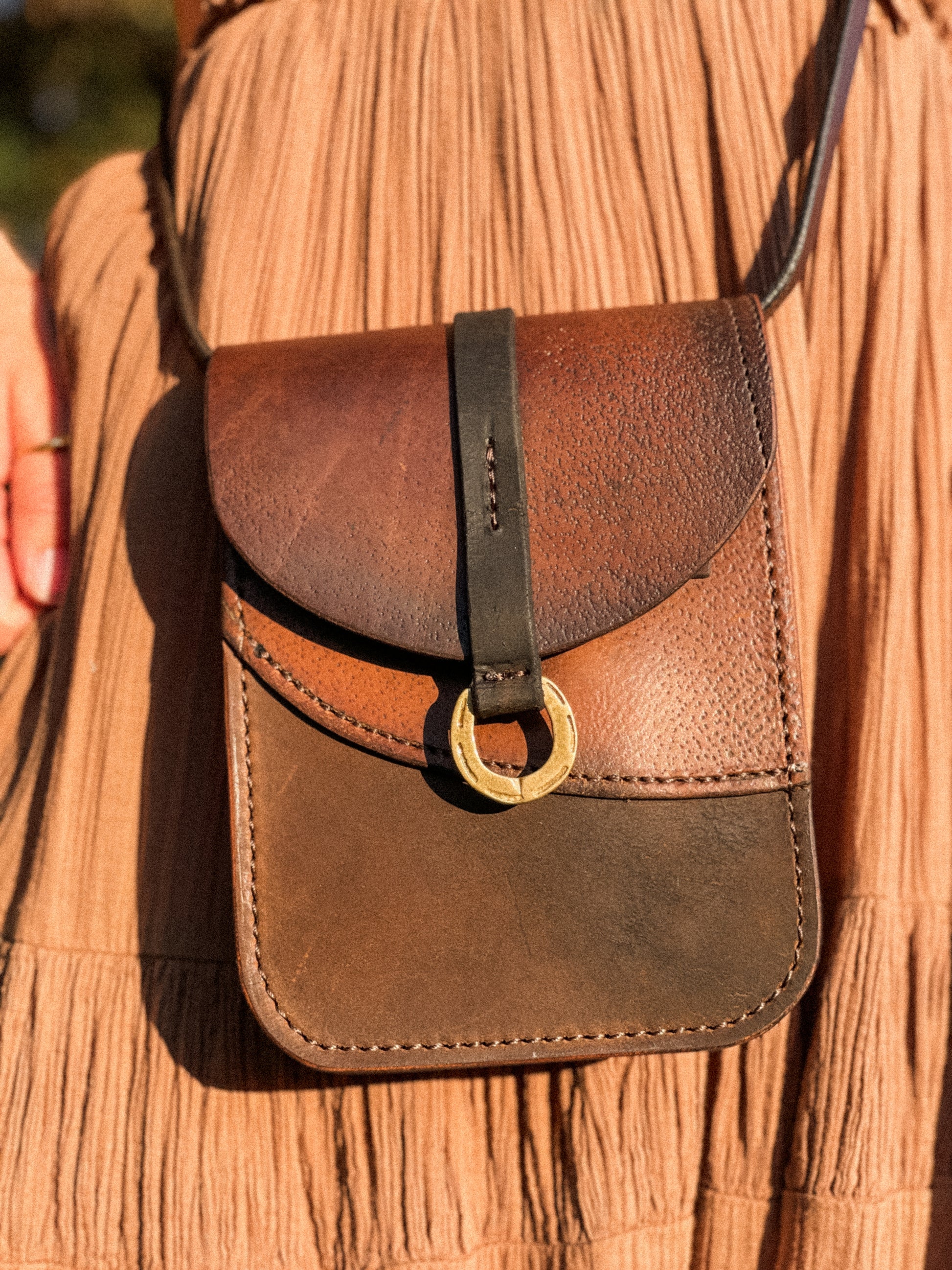 Limited Edition Pamma made with repurposed saddle leather features a vintage horse shoe adornment. An easy everyday carry with enough room for your phone, shades, and a couple extra smalls. Convenience features include a card slot under the flap, a ring for clipping keys on the outside of the bag and a magnetic snap closure. Adjustable crossbody strap. Finished with solid brass hardware.