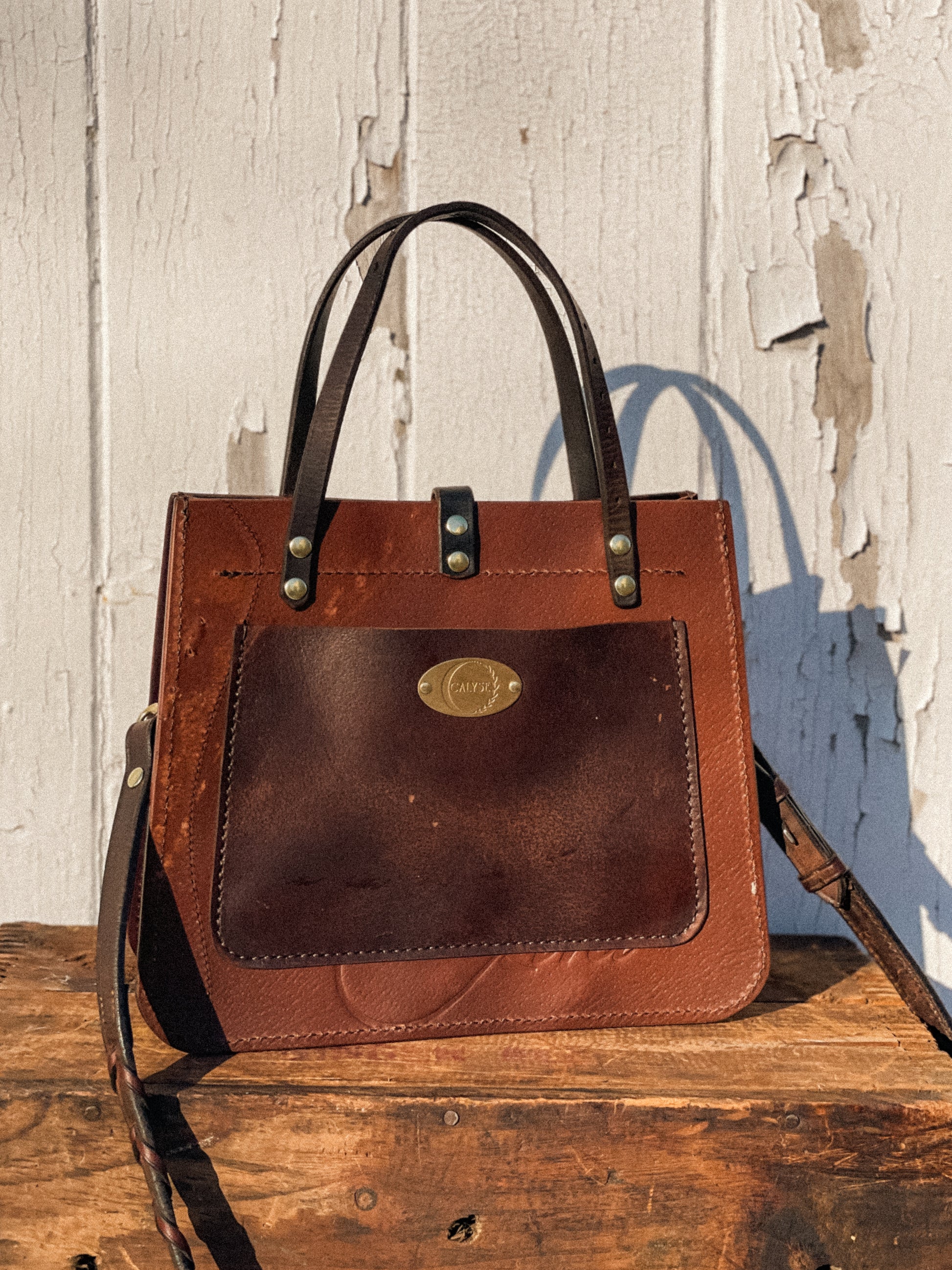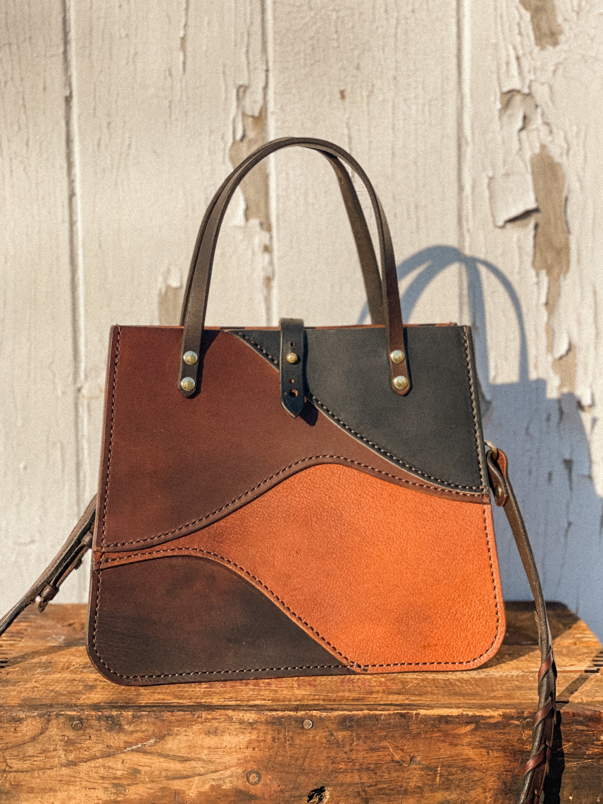 The Patchwork Sylvie is a timeless style tote with an elegant silhouette and structured form that is rugged as it is beautiful. Displaying carefully patch-worked pieces of saddle skirt remnants for a truly unique and even more sustainable bag. Fitted with grab handles that sit atop the bag and an adjustable, detachable adjustable strap made from repurposed tack. Inside is a leather zippered pocket and key ring. Exterior pocket for your phone. Secured with an adjustable collar button closure. Solid brass hardware. Edges are finished and sealed with beeswax for longevity.