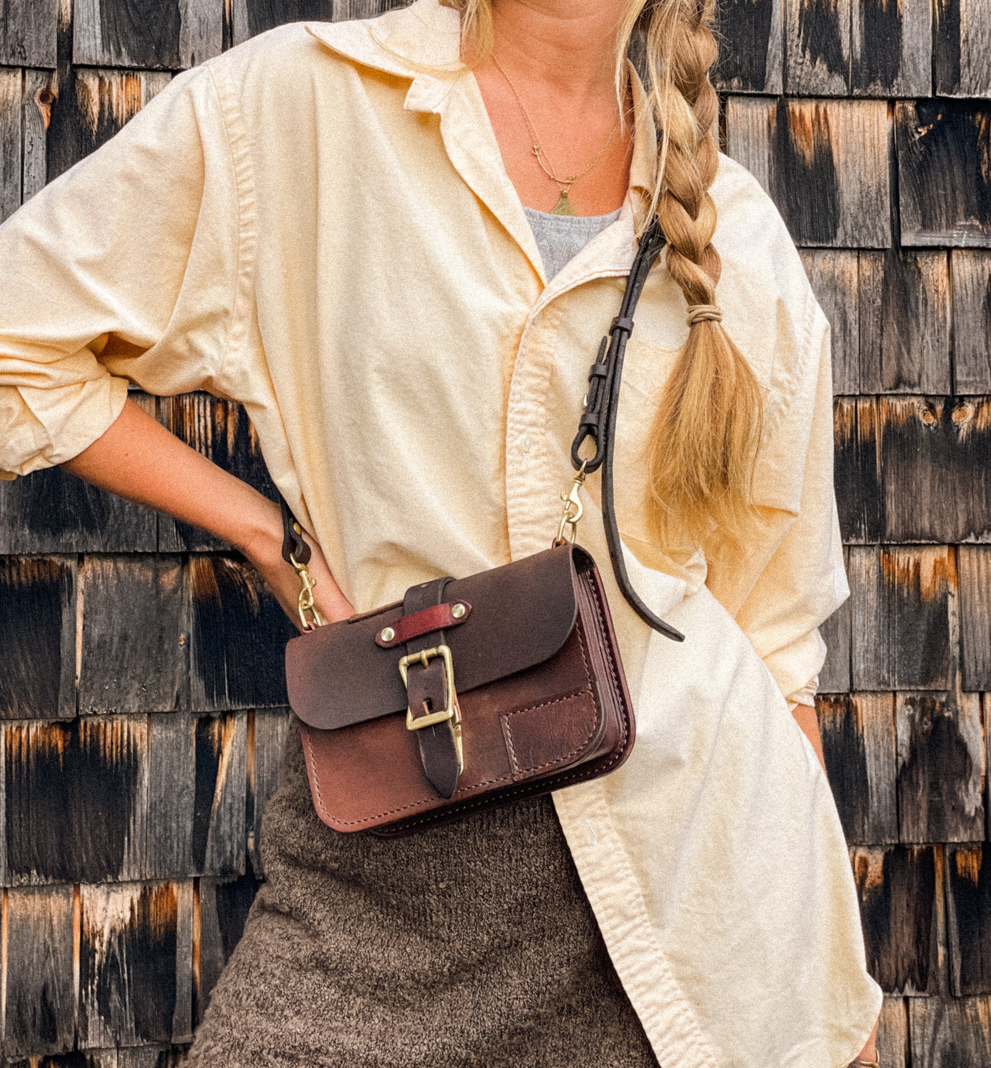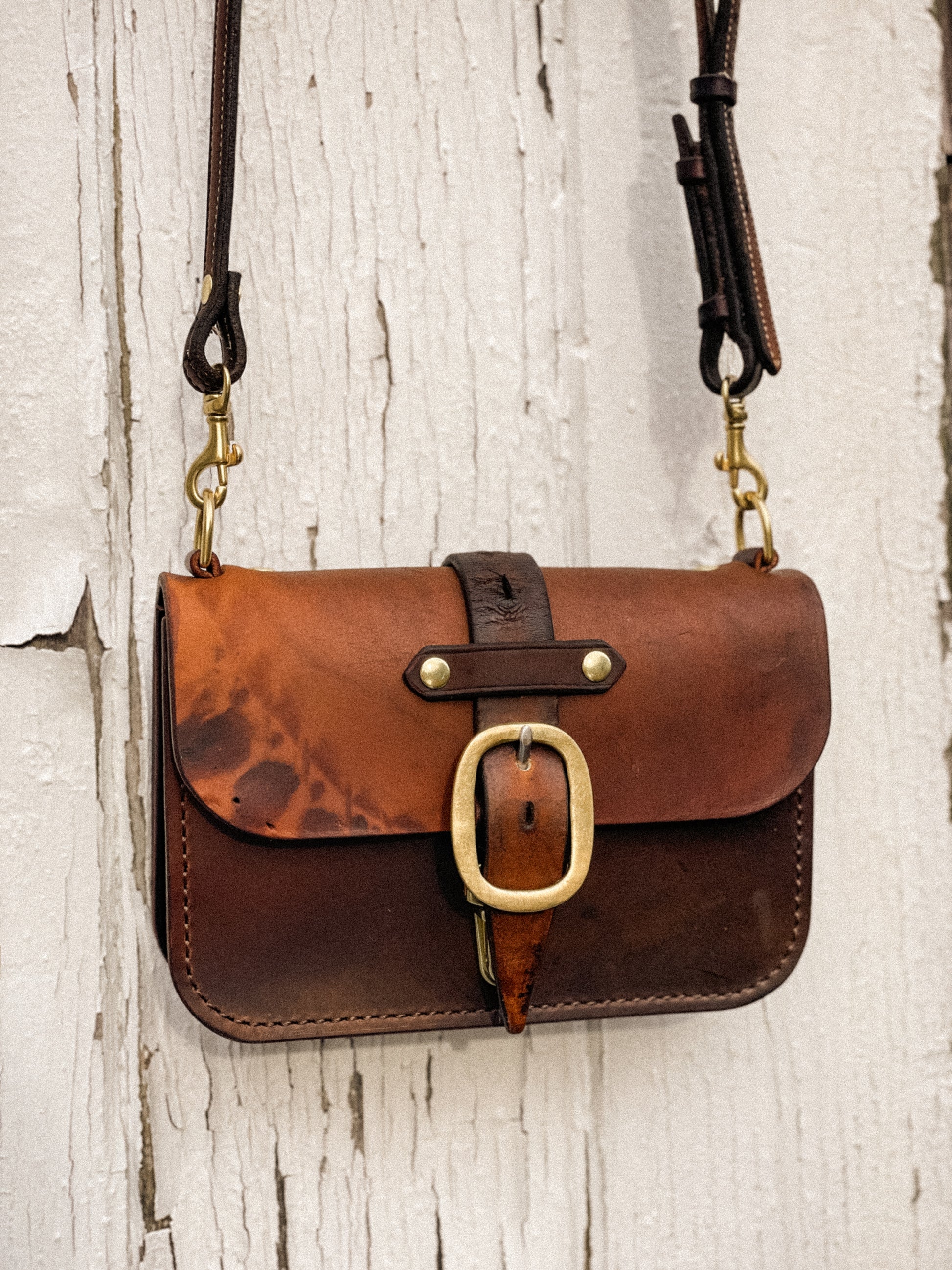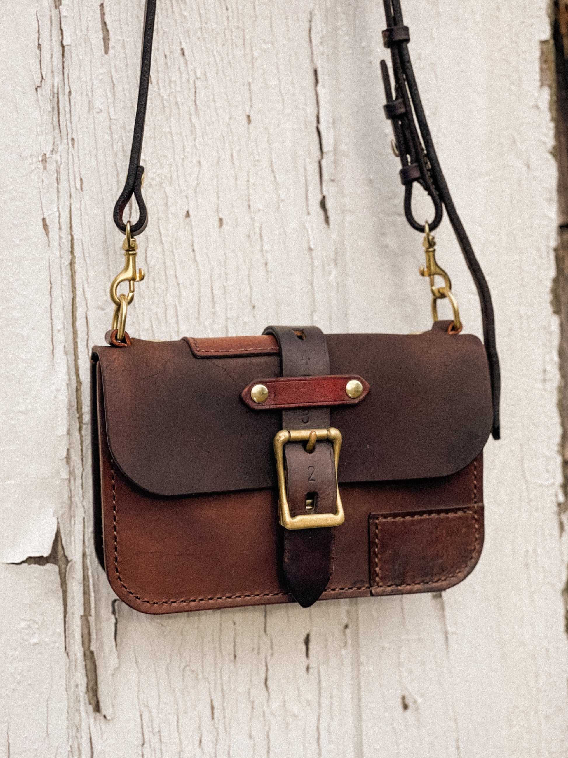 The Saint is a small crossbody bag made from a repurposed vintage saddle. A petite yet sturdy bag with totally unique character. The flap closure is secured by a tuck lock that is easily released with the push of a button. Saint comes with an adjustable crossbody strap that is detachable, made from repurposed tack straps. Adorned in solid, natural brass hardware.