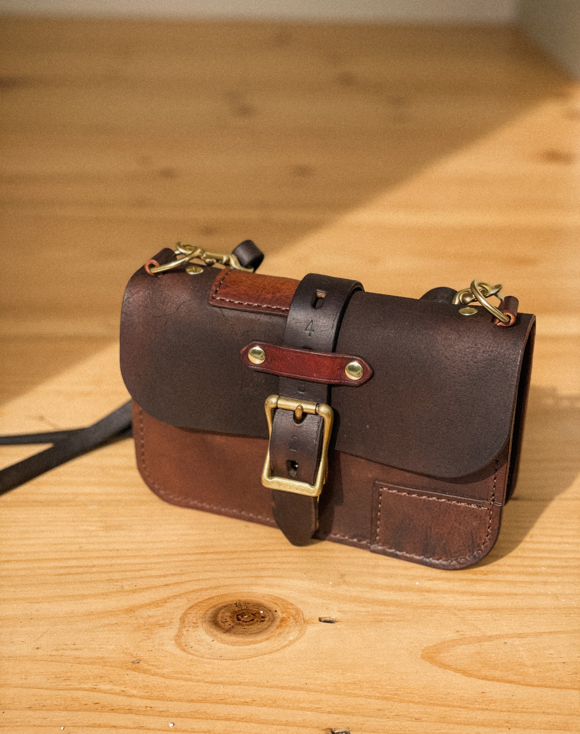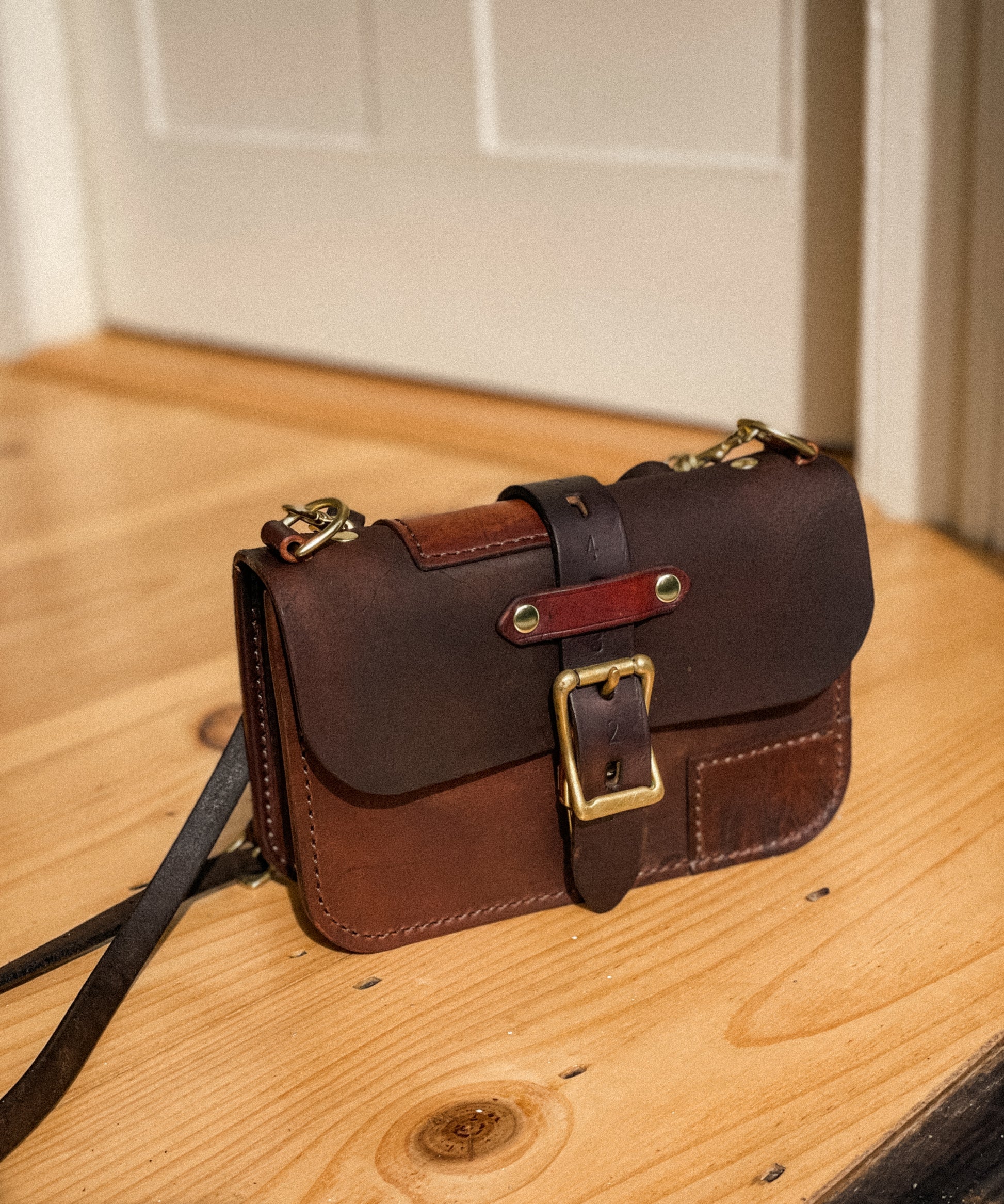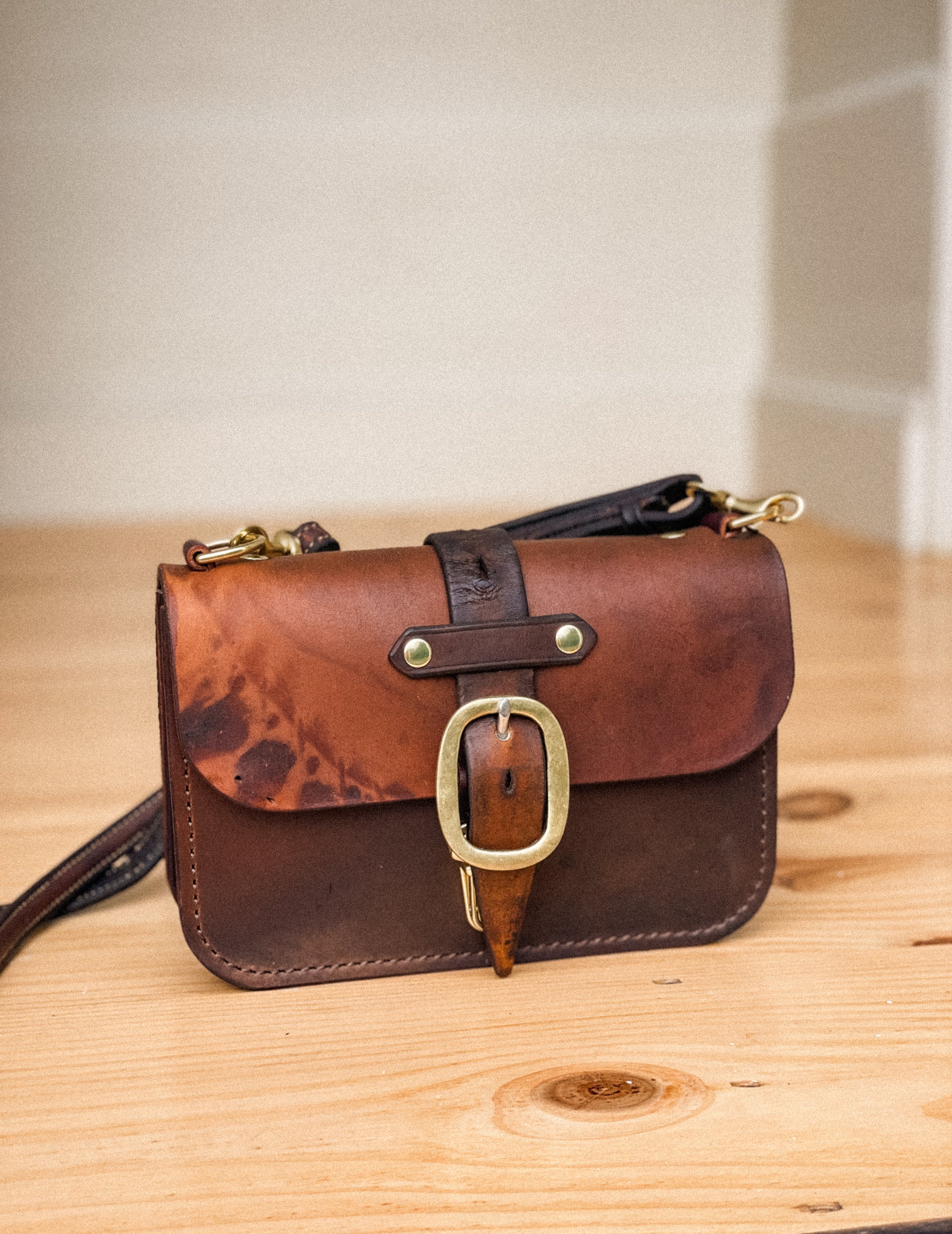 The Saint is a small crossbody bag made from a repurposed vintage saddle. A petite yet sturdy bag with totally unique character. The flap closure is secured by a tuck lock that is easily released with the push of a button. Saint comes with an adjustable crossbody strap that is detachable, made from repurposed tack straps. Adorned in solid, natural brass hardware.