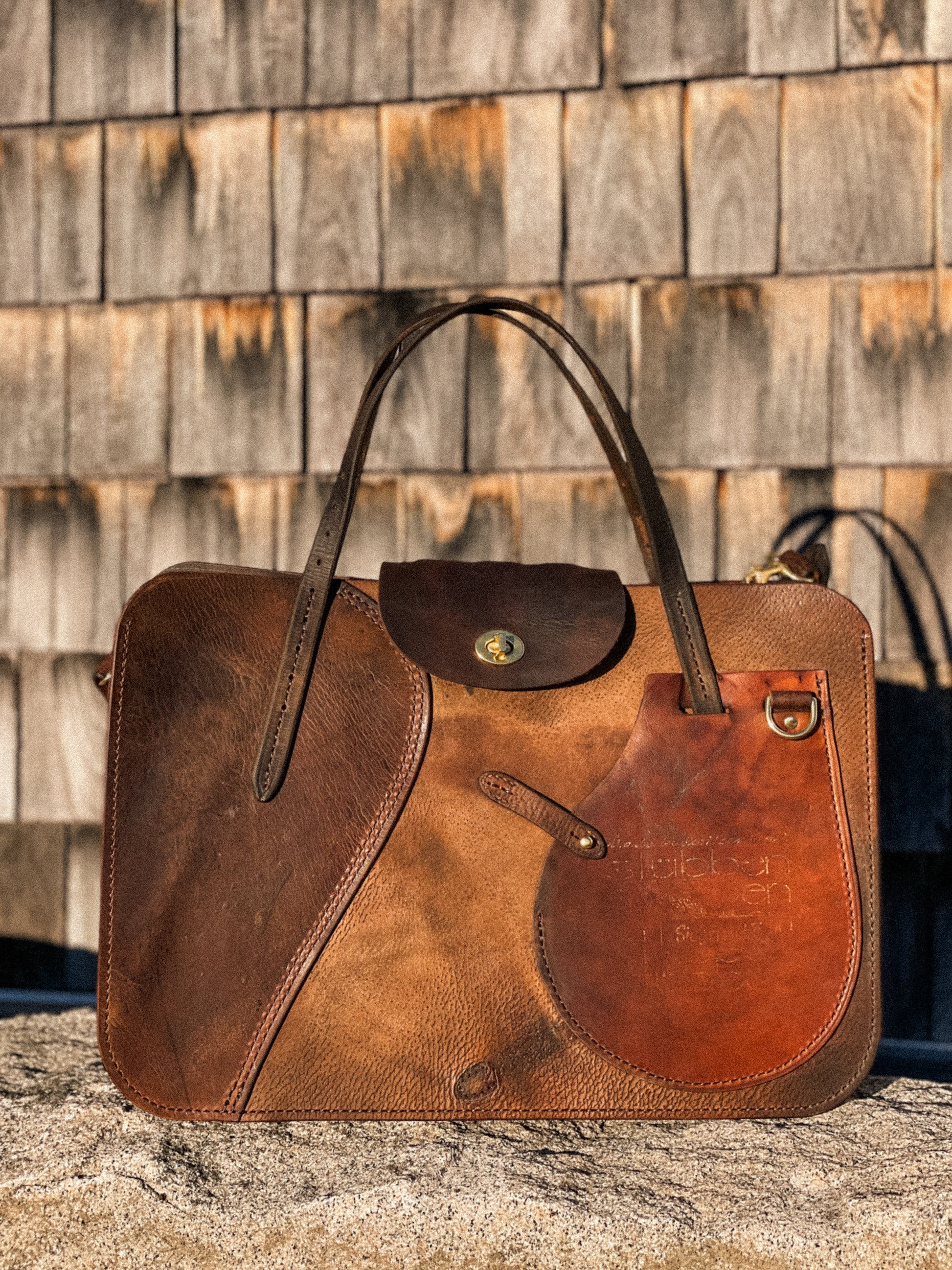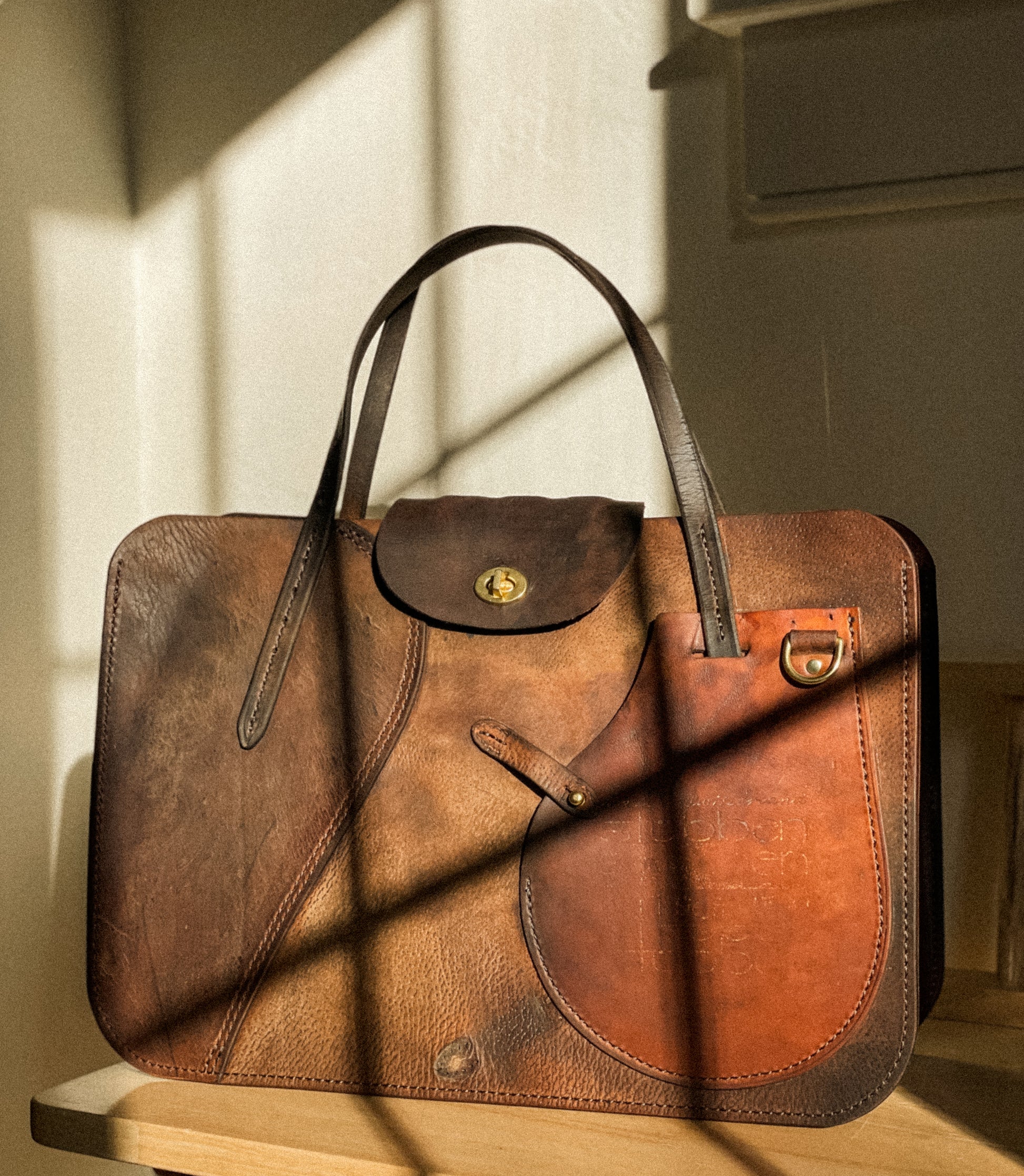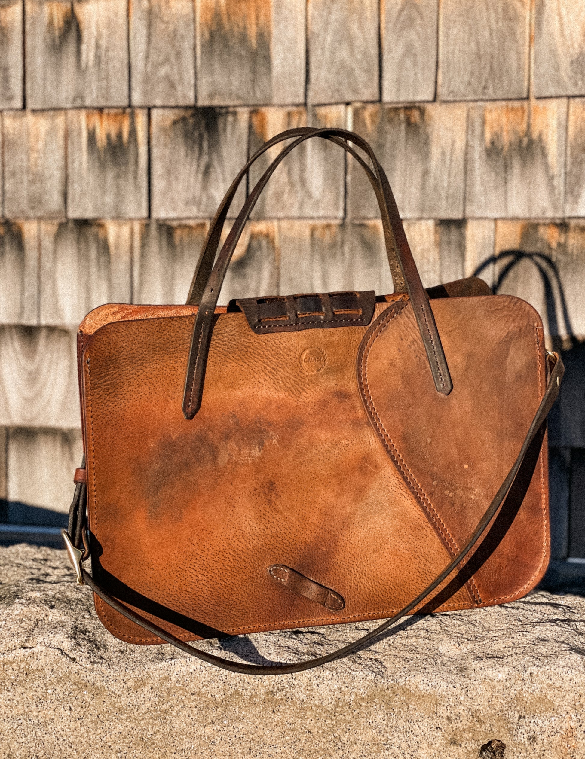 The Shire tote was designed to be your unique, carry-all work bag. The body is patch-worked with varying parts of the saddle, including a billet guard repurposed as the exterior phone pocket. A smaller guard is used for the turn buckle closure. Complete with an interior laptop sleeve, key ring, carry handles and a detachable shoulder strap. Stores up to a 15" wide laptop.